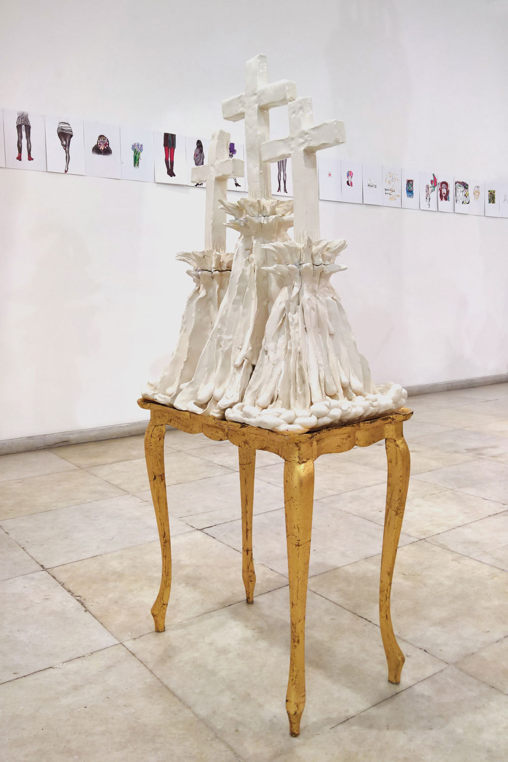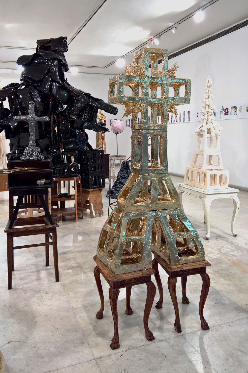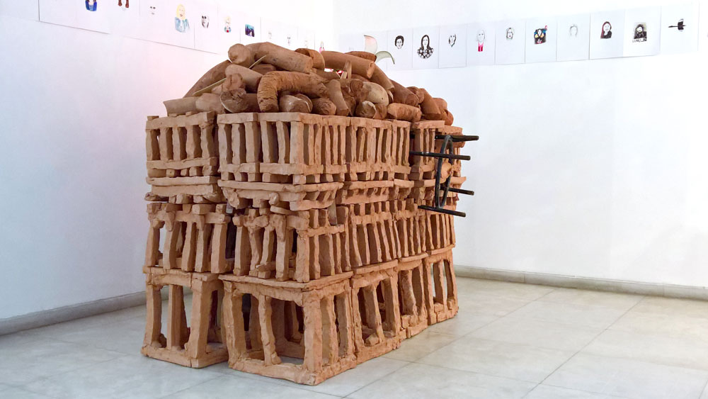 * Γλυπτά από ψημένο άργιλο και οικιακά έπιπλα. Τα έπιπλα σκουπίδια που βρίσκει εγκαταλειμμένα στους δρόμους της Αθήνας, μάρτυρες αστικών βιωμάτων αλλά και ανθρώπινων μέτρων, κτίζουν μια ασφυκτική δομική σχέση με τα υπερμεγέθη κεραμικά που τα καταλαμβάνουν, τα καταπλακώνουν, τα εγκλωβίζουν ή και τα εξαφανίζουν. Τα κεραμικά είναι φτιαγμένα από διάφορα χώματα, αργίλους, πορσελάνες, υαλώματα, χρώματα, κόλλες, σμάλτα, ψυχρά και θερμά, ψημένα δύο και τρεις φορές στους χίλιους βαθμούς κελσίου. Ο άργιλος αποτελούσε και αποτελεί πρωτογενές δομικό υλικό για τελετουργικά εργαλεία, γλυπτά, οικιακά χρηστικά σκεύη, διακοσμητικά παντός είδους και κυρίως είναι οικοδομικό υλικό.