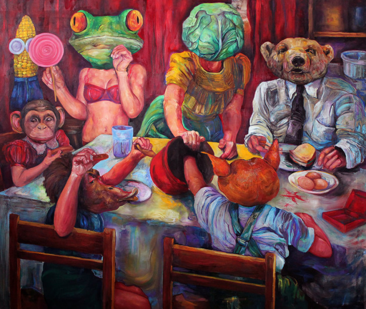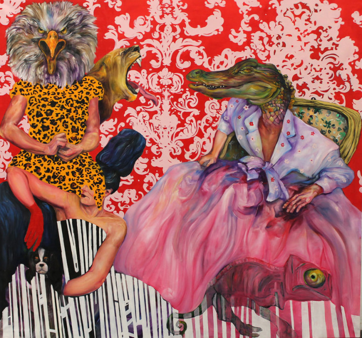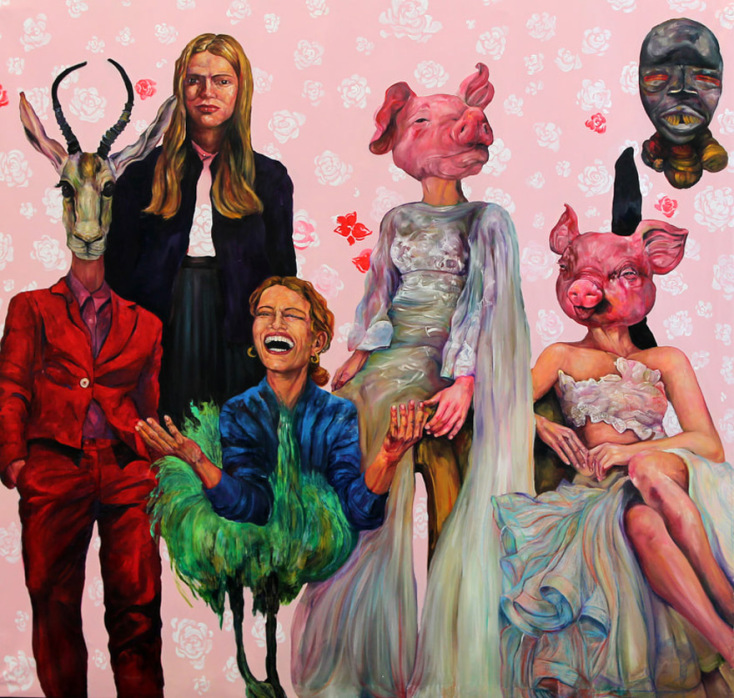 Ένας «χαρούμενος» κόσμος που τίποτα το σκοτεινό δεν έχει, μόνο στοιχεία παραμυθιού, όπου τα κεφάλια των ζώων ενσωματώνονται στα σώματα, ενοποιούνται με αυτά, και φτιάχνουν ένα συμβολικό σκηνικό υπονομευτικό της γιορτής. Μια γλώσσα ειρωνείας για αυτό που βλέπεις ή που περιμένεις να δεις και στη θέση του εμφανίζεται κάτι άλλο, όπως αυτό το πλουμιστό πτηνό στο κάτω σώμα της γυναίκας που ξεκαρδίζεται. Σαν η όψη των πραγμάτων να μην είναι αυτή ακριβώς που δείχνει σε μια πρώτη ανάγνωση. Τα έργα δεν το υπονοούν απλώς, διαπνέονται από πρόδηλη ειρωνεία και σαρκασμό θέτοντας έναν προβληματισμό για τη θέση της γυναίκας και την εικόνα της, χωρίς το ύφος να είναι καταγγελτικό.