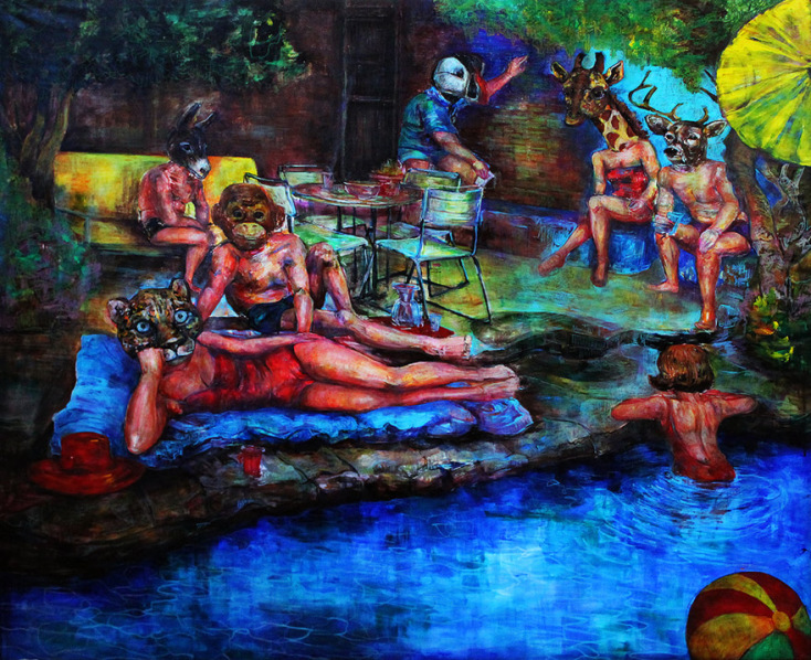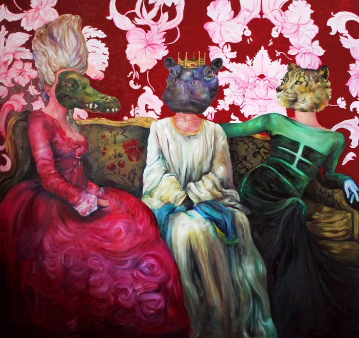 Οι πίνακες της έκθεσης είναι έργα μεγάλων διαστάσεων. Οι φιγούρες αντιστοιχούν στα ανθρώπινα μέτρα, κι όπως στέκεσαι απέναντί τους, είναι εκείνες που σε κοιτάζουν με το ειρωνικό τους βλέμμα, πίσω από τις μάσκες των ζώων, βγαλμένα λες από μύθους του Αισώπου, θέλοντας να φτιάξουν αλληγορίες για τον σύγχρονο άνθρωπο και τις δυσκολίες του, για όσα κρύβονται πίσω από τα ωραία ρούχα και τα σέξι σώματα, πίσω από τον λαμπερό κόσμο των διαφημίσεων και της μόδας.