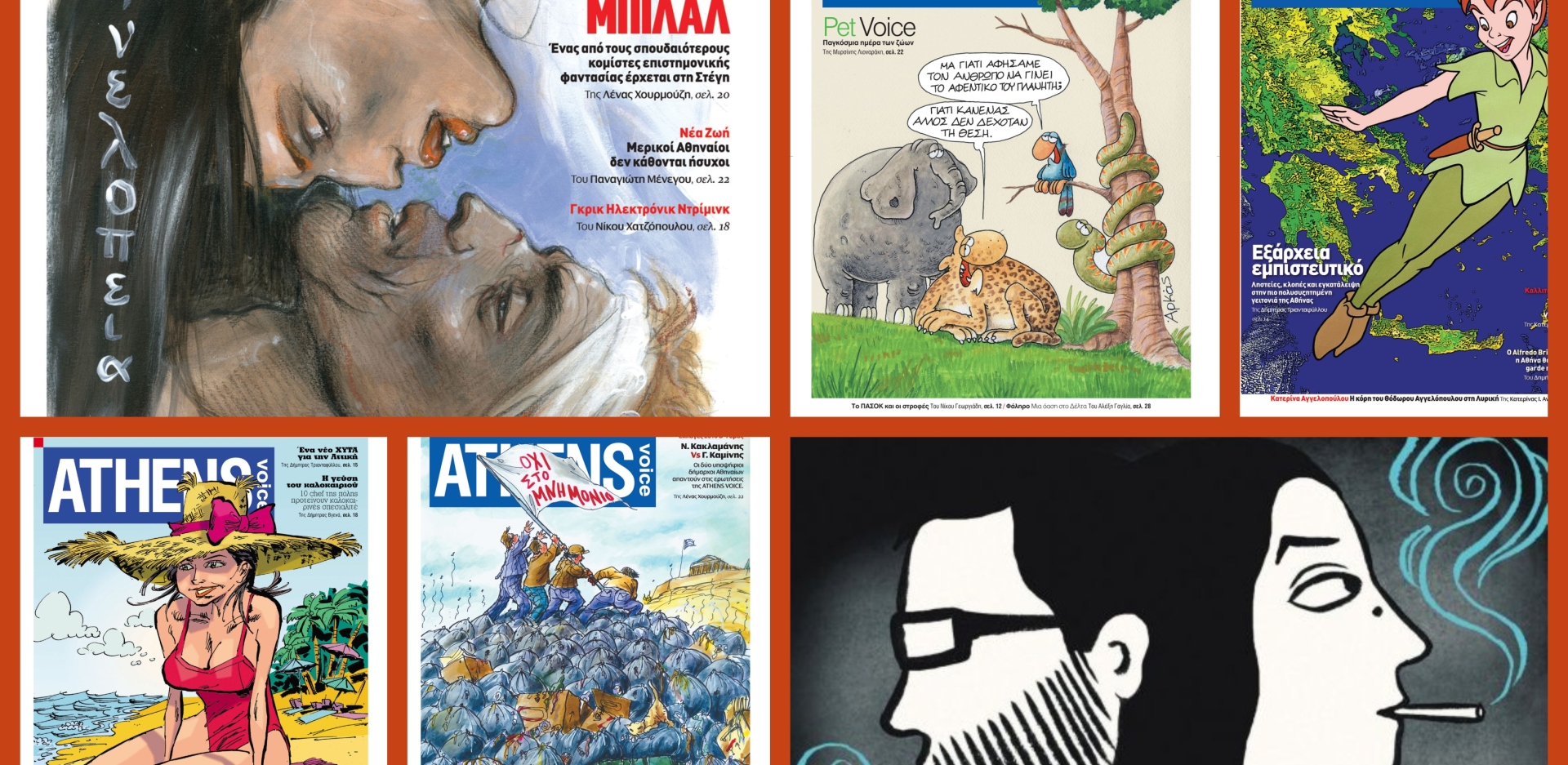 Η εφημερίδα Athens Voice, το πρώτο και μεγαλύτερο ελληνικό free press, είναι μια «κοινότητα» που φιλοξενεί στις σελίδες της εικόνες της πόλης. Καθώς ο μετασχηματισμός της Αθήνας σε μεγαλούπολη ζητούσε και μια «τέχνη της πόλης» για να εκφραστεί, ζωγράφοι, εικονογράφοι, αρχιτέκτονες, γραφίστες, φωτογράφοι, γελοιογράφοι, graffiti artists, έγιναν μέλη της «ομάδας A.V.» και μέσα από τα εξώφυλλά της έδωσαν το δικό τους οπτικό σχόλιο για την καθημερινότητα της πόλης. Τι σχεδίασε ο Milo Manara; Ποια σκίτσα του Αρκά, του Γιάννη Ιωάννου, του Ανδρέα Πετρουλάκη και άλλων σπουδαίων δημιουργών κόσμησαν την πρώτη σελίδα της Athens Voice; Ποιες εικονογραφήσεις μας χάρισαν οι Enki Bilal και Βenoit Pare;