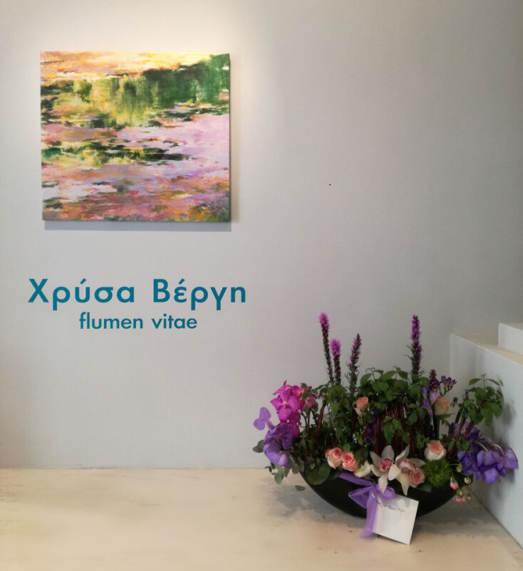 Από τα πρώτα έργα που αντικρίζει κάποιος μπαίνοντας στην γκαλερί Ευριπίδη, όπου αυτές τις μέρες φιλοξενείται η ατομική έκθεση «Flumen Vitae» της Χρύσας Βέργη, μία από τις αξιολογότερες παρουσίες στη σύγχρονη νεοελληνική ζωγραφική, είναι αυτό με τους μικρούς ομόκεντρους κυματισμούς που απλώνονται στα νερά μίας λίμνης από μία πέτρα που ίσως κάποιος πέταξε. Η αναταραχή που δημιουργείται δεν φαίνεται να διαταράσσει καθόλου την ηρεμία και τη γαλήνη του τοπίου.