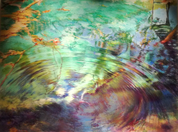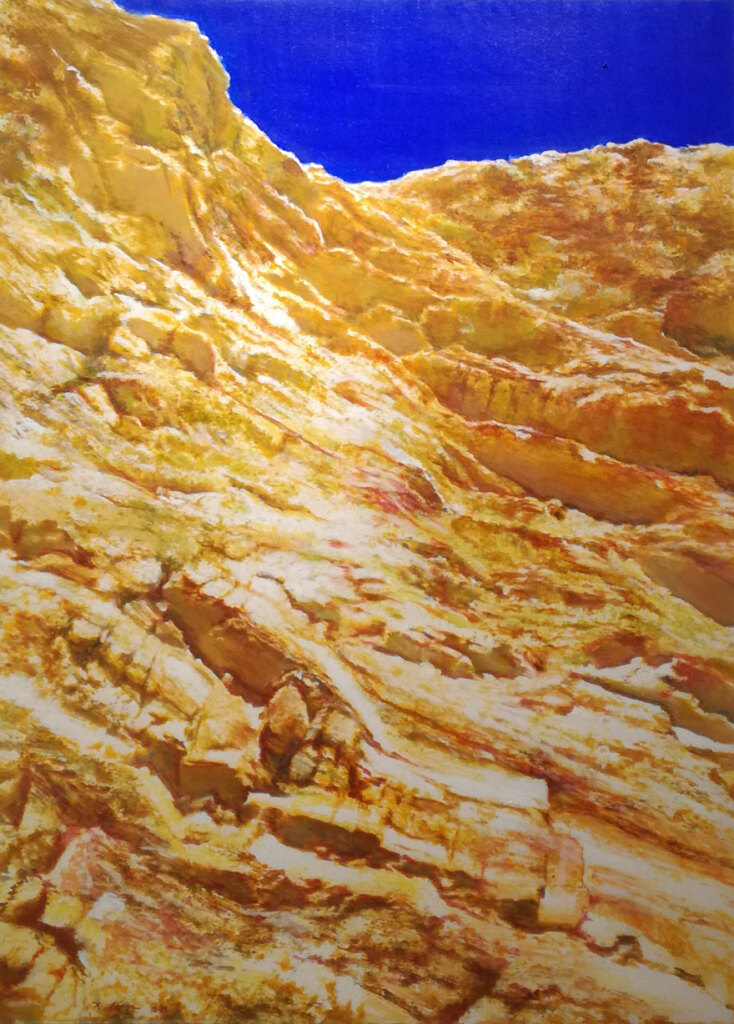 Και σαν αντίβαρο μέσα σε όλα αυτά τα υδάτινα τοπία, ένας τεράστιος, τραχύς, βράχος, σύμβολο αντίστασης και σταθερότητας στον ρέοντα κόσμο, καταλαμβάνει έναν ολόκληρο τοίχο όπου το φως, ως ενεργό στοιχείο μέσα στο έργο, δημιουργεί σκαλοπάτια που οδηγούν σε έναν καταπληκτικό μπλε ουρανό.