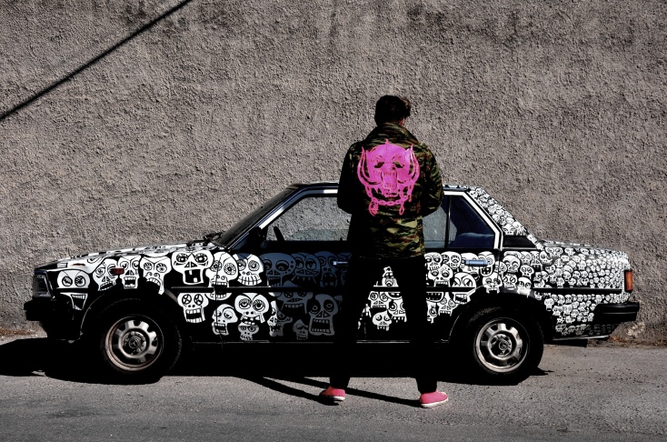 Το αμάξι μου. Η στραcarστρούκα. Επιζωγραφισμένη με νεκροκεφαλάκια απ’ την κορφή ως τα νύχια. Έχει τραβήξει την προσοχή επειδή βρίσκεται εν κινήσει και σε δημόσια θέα μονίμως.