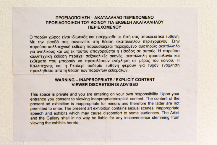 Αυτοί οι πίνακες, κολάζ, κατασκευές (λαμπατέρ;) από άλλον θα μπορούσαν να κοστίζουν εκατομμύρια, να μπαίνουν σε μουσεία, αλλά εδώ θα μπορούσαν και να βανδαλίζονται από αφιονισμένους χριστιανούς. Πικετοφορίες έξω από την Breeder κι έτσι, και η Κιτσοπούλου να είναι καταζήτουμενη και Wanted από πιστούς και ηθικολόγους: γυμνοί παπάδες σε άγρια στύση, διάθεση και προδιάθεση έργων ολίγον διεστραμμένη. Με ολίγη κι από κόκκινο: ξαναμένα μάγουλα, πρησμένοι όρχεις, αιδοία που κοκκίνισαν από την τριβή με τη σέλα του αλόγου, τελευταία ευκαιρία για να καλπάσετε προς Μεταξουργείο φαρ ουέστ και να δείτε το «Between my Legs». Ο χώρος είναι ιδιωτικός, εισέρχεστε με δική σας αποκλειστική ευθύνη. Άντε, πάμε να πούμε και τίποτα, σηκωνόμαστε από το ταβερνείο απέναντι και μπαίνουμε πάλι στη Breeder για τη συνέντευξη, και τι και πώς και άλλα διάφορα.
