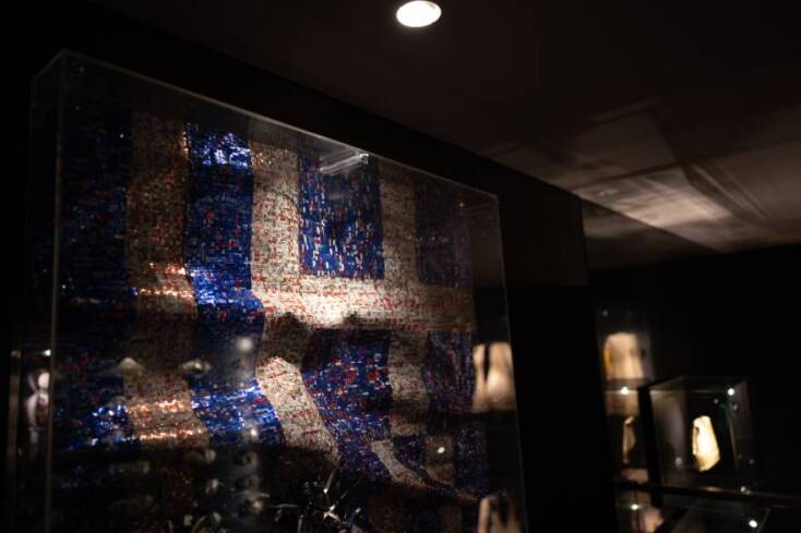 Καθώς εισέρχεται ο επισκέπτης στο μουσείο, βλέπει στον προθάλαμο, τη γλυπτή ενδυμασία της Λασκαρίνας Μπουμπουλίνας, ένα έργο ύψους λίγο πάνω από δυόμιση μέτρα, σίγουρα πολύ επιβλητικό. Στην πρώτη αίθουσα του ισογείου, η Δέσπω Τζαβέλα, δεσπόζει σε ανάγλυφο πορτραίτο ανάμεσα στις παραδοσιακές ενδυμασίες της Πελοποννήσου, τμήμα της μόνιμης συλλογής του μουσείου. Στα δεξιά μας βλέπουμε την εντυπωσιακή λόγω των έντονων χρωμάτων και του μεγέθους (1,90 εκ. ύψος) γλυπτή ενδυμασία της Πανωραίας Χατζηκώνστα, γνωστής και ως «Ψαροκώσταινας», αρχόντισσας από το Αϊβαλί. Στη συλλογή βρίσκεται και η ελληνική σημαία, μόνο που αυτή τη φορά δεν έχει μόνο τα χρώματα της γαλανόλευκής αλλά και το κόκκινο που πρόσθεσε ο Νίκος Φλώρος. Στο κάτω μέρος υπάρχουν ξέφτια, το καθένα από τα οποία συμβολίζει και ένα πλήγμα στη γαλανόλευκη θωριά της.