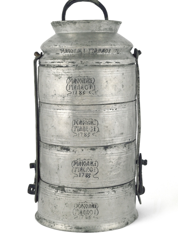 από κράμα χαλκού σφυρήλατο. Σε κάθε δοχείο και στο σκέπασμα επαναλαμβάνεται η επιγραφή [Κτήμα] «ΜΑΝΟΛΑΚΙ ΠΑΛΑCΙ 1785». Παρουσιάζονται στην ενότητα που αφορά την καθημερινότητα στην προεπαναστατική Ελλάδα καταγράφοντας με τρόπο έμμεσο, την σχέση των ανθρώπων με την τροφή και τη διατροφή είτε στο σπίτι είτε στον πόλεμο είτε στις εργασίες στην ύπαιθρο. Ανήκει στη συλλογή του Κοινωφελούς Ιδρύματος Κοινωνικού και Πολιτιστικού Έργου (ΚΙΚΠΕ).