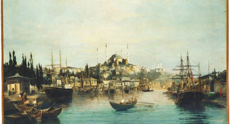 Κωνσταντίνος Βολανάκης (1837-1907), Στον Κεράτιο κόλπο (λεπτομέρεια, 1892). Η Κωνσταντινούπολη ως πόλη σύμβολο του ελληνισμού συγκινούσε βαθύτατα τους Έλληνες καθ’ όλη τη διάρκεια του 19ου και στις αρχές του 20ουαιώνα. Η έκθεσή μας, στο ιστορικό της πλαίσιο ξεκινάει και ολοκληρώνεται με δύο εικόνες της Κωνσταντινούπολης. Μία του 1794 του Μουσείου Μπενάκη και τη συγκεκριμένη του 1892 με τον «Κεράτιο κόλπο» του Κ. Βολανάκη από την Συλλογή Έργων Τέχνης της Alpha Bank. Έτσι, με τα δύο αυτά έργα, παρά την μεσολάβηση 1.000 και πλέον σπανίων αντικειμένων τέχνης και ιστορίας από την αρχή έως των τέλος της έκθεσής μας, ορίζουμε ένα κύκλο ιδεολογικού πατριωτισμού και ευαισθησίας που, έμμεσα ή άμεσα, επηρέασε την τέχνη, την κοινωνία και, βεβαίως, την κοινωνική ζωή. Ο Κεράτιος του Βολανάκη αφήνει μια νοσταλγική αίσθηση ενός απώτατου παρελθόντος, που υπήρξε άγνωστο αλλά και επιθυμητό.