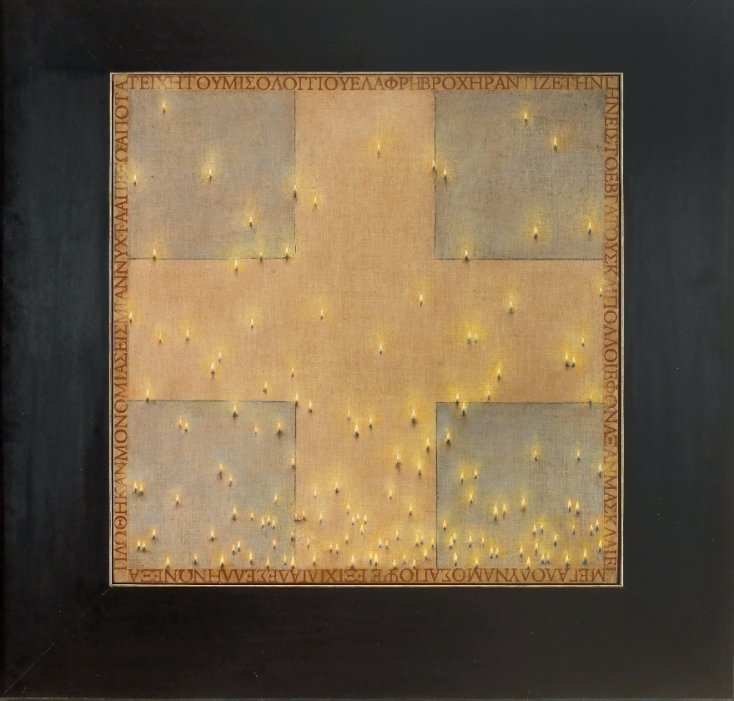 Χρήστος Μποκόρος, Έξοδος (2006). Χρώματα λαδιού και τυπωμένο χαρτί σε πανί και ξύλο, από τη Συλλογή Σωτήρη Φέλιου. Στη σύγχρονη ελληνική τέχνη καταγράφεται με τρόπο γοητευτικό και βαθύτατο ο απόηχος της Επανάστασης του 1821. Καταγράφεται, δηλαδή, με το βλέμμα των καλλιτεχνών του 20ου αιώνα η αίσθηση περηφάνειας, ταυτότητας και συγκίνησης που διακρίνει τους Έλληνες και τις Ελληνίδες στα 200 χρόνια που μεσολάβησαν. «Οι φλογίτσες» του Χρήστου Μποκόρου με φόντο την ελληνική σημαία μας δίνουν την βεβαιότητα ότι τα παιδιά του μέλλοντος θα διατηρήσουν, έστω και με άλλη ματιά, ως παρακαταθήκη τους τη συγκίνηση που ακόμα γεννάει η Επανάσταση και η γέννηση του ελληνικού κράτους.