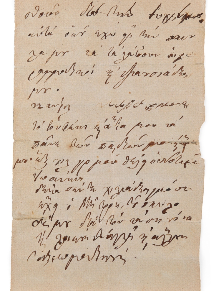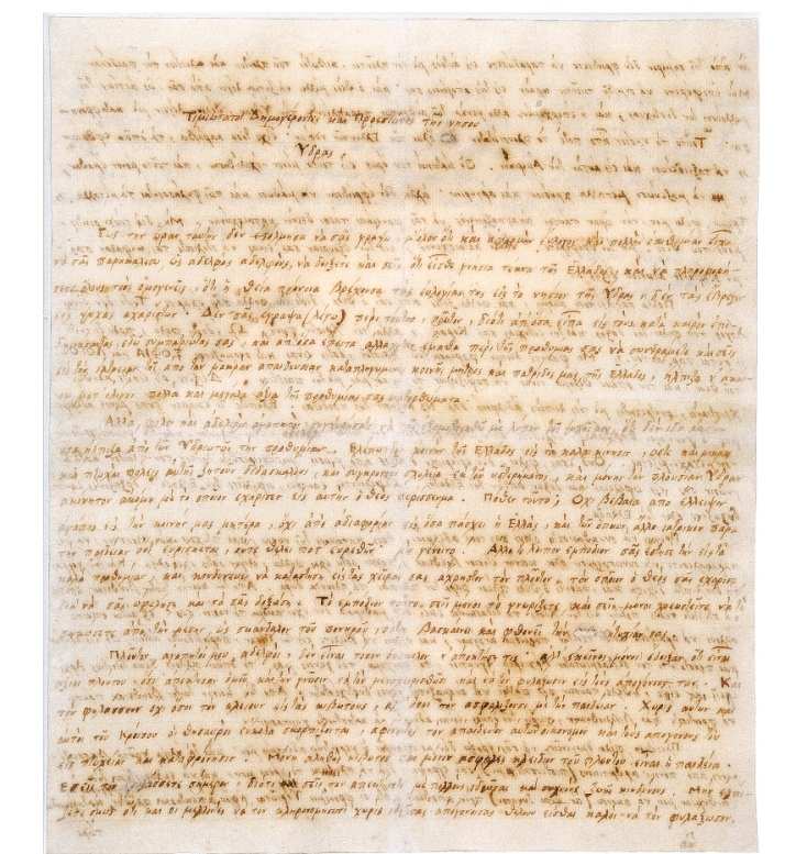 Επιστολή του Αδαμάντιου Κοραή προς τους Δημογέροντες και Προεστούς της Ύδρας, με την οποία τους προτρέπει να ενδιαφερθούν, παράλληλα με τον πλουτισμό, για την καλλιέργεια της παιδείας (Ιούνιος 1820). Ο Χιώτης σοφός στη χειρόγραφη επιστολή του καταφέρνει και συνδέει με άμεσο τρόπο την οικονομική ανάπτυξη των πλοιοκτητών με την ανάγκη για βελτίωση του επιπέδου της παιδείας μεταξύ των Ελλήνων. Στην κατεύθυνση αυτή, ο Κοραής δικαιολογημένα αποτελεί την πλέον εξέχουσα μορφή του νεοελληνικού διαφωτισμού και για το λόγο αυτό τον προβάλαμε ιδιαίτερα στην έκθεσή μας.