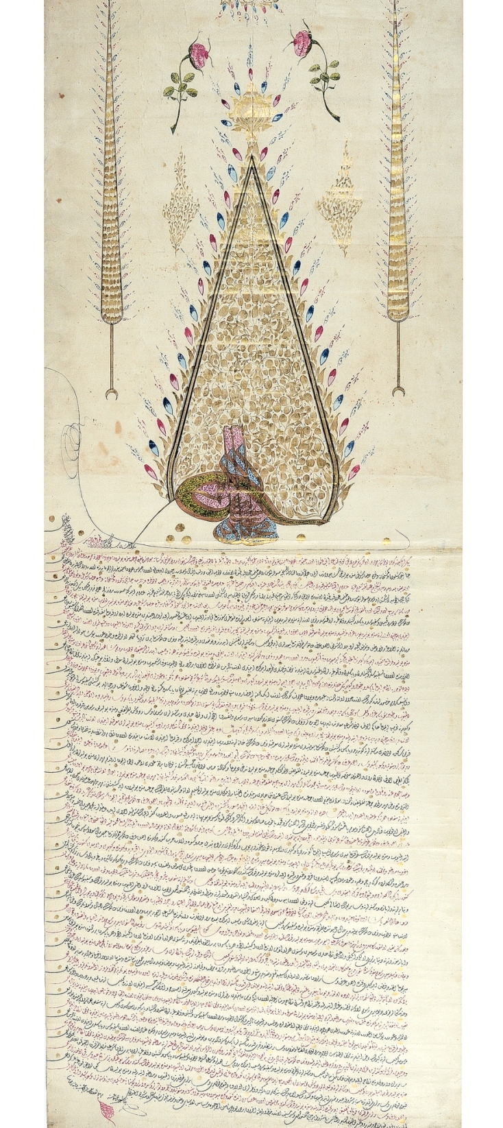 Σουλτανικό Βεράτι του Μαχμούντ Β΄ για τον διορισμό του Σωφρόνιου στις Μητροπόλεις Τζανίκ, Σελβίν, Αργυρούπολης, Καρά Χισάρ και Σαρκί (Μάϊος 1808). Στο σπάνιο σουλτανικό φιρμάνι διαβάζουμε με τρόπο έμμεσο το υψηλό κύρος του Οθωμανού Αυτοκράτορα αλλά και τη λειτουργία και ανάπτυξη της ελληνικής ορθόδοξης εκκλησίας και λατρείας στις περιοχές του Πόντου. Το ιδιαίτερα καλαίσθητο αυτό τεκμήριο εντάσσεται στην έκθεση γιατί έχει τρεις δικές του εσωτερικές ιστορίες. Η πρώτη αφορά στη δυνατότητα των Ρωμιών να επισκευάζουν τις εκκλησίες τους. Η δεύτερη αφορά στην ύπαρξη «φτωχών» αντιγράφων, από μαύρη μελάνη σε λευκό χαρτί χωρίς κανένα στολίδι,στο κεντρικό οθωμανικό αρχείο της Κωνσταντινούπολης και η τρίτη αφορά το γεγονός ότι το τεκμήριο διασώθηκε από ξεριζωμένους Έλληνες πρόσφυγες κατά την ανταλλαγή πληθυσμών το 1923. Διασώθηκε ως ένα τεκμήριο κοινοτικής περιουσίας των χριστιανικών χωριών, ένα τεκμήριο σεβασμού και λατρείας για αυτά που άφησαν πίσω.