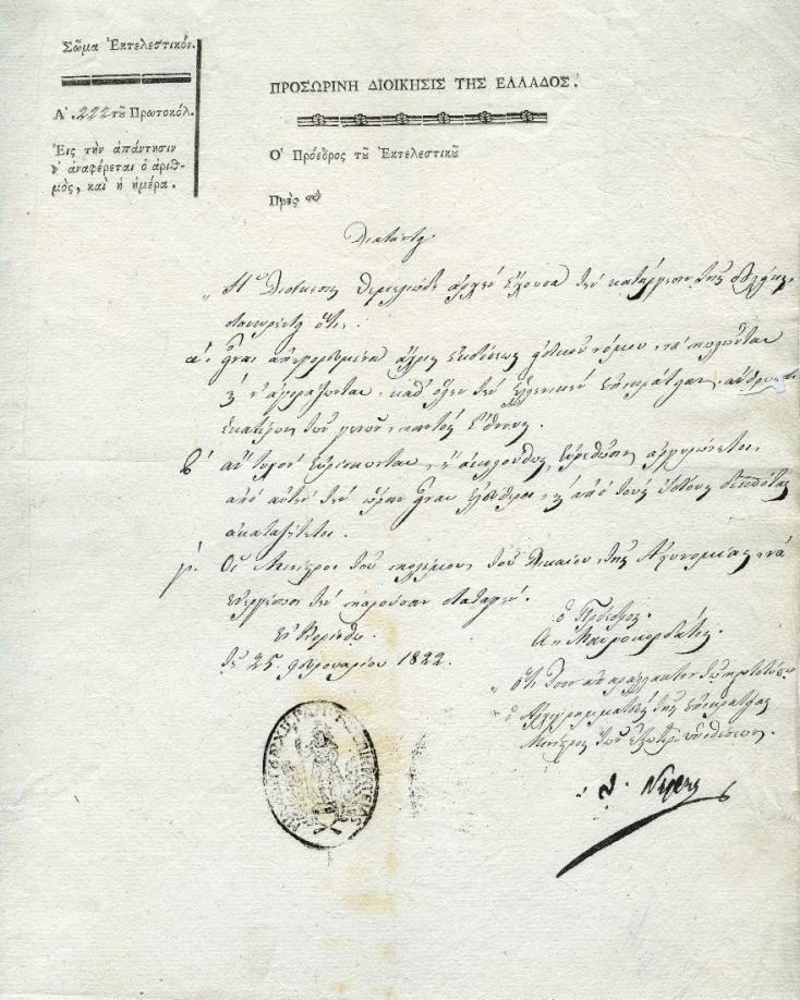 Διάταγμα της Προσωρινής Διοίκησης της Ελλάδας, με το οποίο απαγορεύεται «να πωλούνται και να αγοράζωνται […] άνθρωποι εκατέρων των γενών, παντός έθνους» σε όλη την ελληνική επικράτεια (25 Φεβρουαρίου 1822). Στο σπάνιο αυτό χειρόγραφο διάταγμα της επαναστατικής κυβέρνησης με τις υπογραφές του Αλέξανδρου Μαυροκορδάτου και του Θεόδωρου Νέγρη καταγράφεται η κατάργηση της δουλείας ανθρώπων. Παρά τις όποιες ίσως αντίθετες φωνές, οι πολιτικοί της επανάστασης με την απόφαση αυτή δίνουν «εξετάσεις» στις ελίτ και τους διανοούμενους πολιτικούς της Δύσης ότι μετά την απελευθέρωση των Ελλήνων προτίθενται να δημιουργήσουν ένα σύγχρονο κράτος με σεβασμό στα ανθρώπινα δικαιώματα.