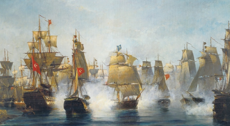 Κωνσταντίνος Βολανάκης (1837-1907), Η Έξοδος του Άρεως, από τη Συλλογή Ευαγγέλου και Κατίγκως Αγγελάκου. Σε αυτόν το σπάνιο πίνακα του Βολανάκη αποτυπώνεται η μαχητικότητα και η υπέρμετρη πολεμική προσπάθεια των Υδραίων ναυτικών του 1821. Ο Βολανάκης με το έργο του κληρονομεί στις επόμενες ελληνικές γενιές τις μεγάλες προσπάθειες αλλά και την ένταση του ναυτικού Αγώνα. Το έργο δεν συμπληρώνει απλώς την έκθεση αλλά με το «κύρος» του και την αισθητική του ενισχύει καθοριστικά την αφήγησή μας.