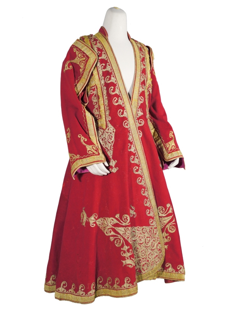 Ντουλαμάς (είδος μακριού επενδύτη) του Πετρόμπεη Μαυρομιχάλη. Κεντημένο με χρυσόνημα σε τσόχα το σπάνιο ένδυμα, άγνωστο ως σήμερα, βρέθηκε στις αποθήκες του Μουσείου Μπενάκη. Αποτελεί δωρεά της οικογένειας Μαυρομιχάλη ήδη από την δεκαετία του 1950, αποκαταστάθηκε με μεγάλη φροντίδα από το εργαστήρι Συντήρησης του Μουσείου και παρουσιάζεται στην έκθεση ως τεκμήριο πολυτέλειας που διέκρινε την μεγάλη οικογένεια της Μάνης.