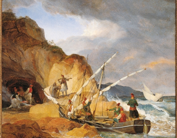 Karl Wilhelm von Heideck (1788-1861), Έλληνες ναυτικοί (1831). Ο Karl Wilhelm von Heideck, ένας εκ των τριών αντιβασιλέων των αρχών της οθωνικής περιόδου, υπεύθυνος για τα στρατιωτικά θέματα του ελληνικού κράτους, υπήρξε και ένας πολύ ευαίσθητος ζωγράφος ο οποίος δημιούργησε πάνω από σαράντα έργα αναφερόμενα στην Ελλάδα και στα οποία απεικονίζονται μάχες, γνωστοί πολεμιστές, αρχαιολογικοί χώροι και τοπία. Η ζωγραφική του διακρίνεται για την έμφαση στη χρήση του χρώματος και την πολύ καλή προοπτική οργάνωση του χώρου. Χάρη στις λεπτομέρειες των συνθέσεών του μπορούμε να ανακτήσουμε ιστορικές πληροφορίες της εποχής. Δωρεά Δαμιανού Κυριαζή στο Μουσείο Μπενάκη.