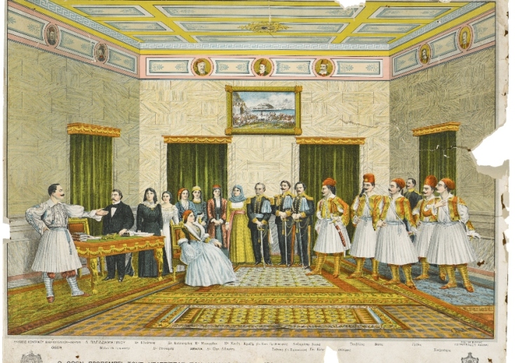 Σωτήριος Χρηστίδης (1858-1940), Ο Όθωνας προπέμπει τους υπασπιστάς του αναχωρούντας προς απελευθέρωσιν των υποδούλων Ελλήνων του 1854. Σπάνια λαϊκή λιθογραφία του 20ου αιώνα που αποδίδει με τρόπο «δραματικό» την αντοχή της Μεγάλης Ιδέας, της πατριωτικής ιδεολογίας του αλυτρωτισμού που ξεκίνησε στα μέσα του 19ου αιώνα ως η κύρια ιδεολογία του νεότερου ελληνισμού μέχρι το 1922 και την Μικρασιατική καταστροφή.