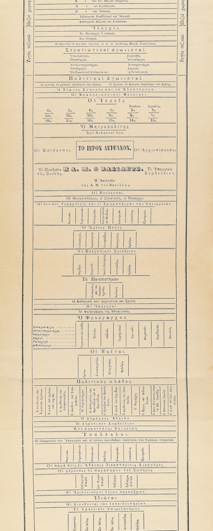 Διάγραμμα της πορείας κατά τη μετακομιδή του ιερού λειψάνου του ιερομάρτυρος Γρηγορίου Ε΄ Αρχιεπισκόπου Κωνσταντινουπόλεως και Οικουμενικού Πατριάρχη, σύμφωνα με το πρόγραμμα της τελετής (22 Απριλίου 1871). Στο τεκμήριο δεν φαίνεται με μια πρώτη ματιά η ουσιαστική πληροφορία που μας προσφέρει. Το έγγραφο δεν αποδίδει μόνο τον λαϊκό και εθνικό σεβασμό στον Πατριάρχη που απαγχονίστηκε από τους Τούρκους. Παράλληλα αναδεικνύει με τρόπο σαφέστατο τη λειτουργία των κρατικών δομών αφού στο «πρόγραμμα» αυτό καταγράφεται με τρόπο αυστηρό και λεπτομερή η ιεραρχία των κρατικών αξιωματούχων και της κρατικής διοίκησης.