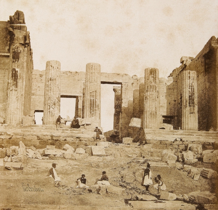 James Robertson (1813-1888), Άποψη του κεντρικού κτηρίου των Προπυλαίων από δυτικά (1853-1854). Στην τρίτη ενότητα της έκθεσης είχαμε «σύμμαχό» μας και τις φωτογραφίες από τα φωτογραφικά αρχεία του Μουσείου Μπενάκη. Οι φωτογραφίες των αρχών της οθωνικής περιόδου βρίσκονται στο μεταίχμιο μεταξύ ζωγραφικής και φωτογράφησης. Στην κατεύθυνση αυτή αποτελούν μαρτυρίες ενός κόσμου που αποδίδεται με τρόπο καινούριο αλλά που διατηρεί το πλήθος των αρχικών του συμβολισμών. Δωρεά Ρένας Ανδρεάδη στο Μουσείο Μπενάκη.