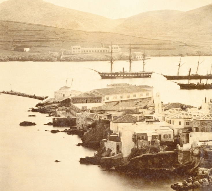 Ανδρέας Βλαχάκης, Σύρος, στερεοσκοπική φωτογραφία σεαλμπουμίνη, του 1880 περίπου. Η Σύρος αποτέλεσε για μερικές δεκαετίες το κεντρικότερο εμπορικό λιμάνι του ελληνικού βασιλείου αφού βρισκόταν στη ναυτική διαδρομή μεταξύ Κωνσταντινούπολης και των παραλίων της Αφρικής. Η αισθητική και οικονομική ευρωστία της Ερμούπολης είναι σήμερα μάρτυρας ενός παρελθόντος που στον 21ο αιώνα φαίνεται πάρα πολύ μακρινό. Απαραίτητη, λοιπόν, η παρουσία της Σύρου σε μια έκθεση που η οικονομία και η κοινωνία έχουν πρωτεύοντα ρόλο. Από την Νεοελληνική Ιστορική Συλλογή Κωνσταντίνου Τρίπου.