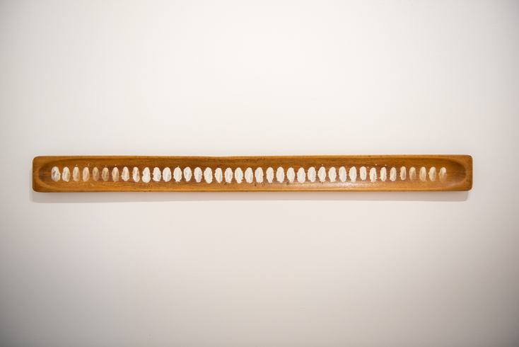 Λίγο πριν βγω στον κήπο για να τον συναντήσω, στάθηκα μπροστά από τους ζωγραφικούς πίνακές του. Έργα σε χαρτί και σε ξύλο, φτιαγμένα με έναν ιδιότυπο χρωστήρα: τα δάχτυλα των χεριών του. Δεκαετίες τώρα ο Ρίτσαρντ Λονγκ δουλεύει με το σώμα, τα χέρια και τα πόδια του. Είναι τα εργαλεία του. Στην περίπτωση βέβαια των συγκεκριμένων πινάκων που φτιάχτηκαν στην πατρίδα του το Μπρίστολ, πρώτη ύλη είναι η περίφημη γκρι λάσπη που καλύπτει τις όχθες του ποταμού Έιβον, υλικό που εμμένει να χρησιμοποιεί στις επιτοίχιες εγκαταστάσεις του, όπως σε αυτή που φιγουράρει σε έναν τοίχο της Bernier Eliades. Εν είδει βραχογραφίας, ο Ρίτσαρντ Λονγκ έστησε μέσα στην Bernier Eliades μια προσομοίωση πρωτόγονης φύσης, όμοιας με αυτή που συναντά στα ταξίδια του στις εσχατιές του κόσμου.