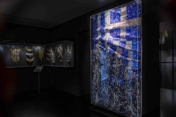 Χαλαρώνω κάπου εδώ, γιατί ξαναδιαβάζοντας με, βλέπω πως διολισθαίνω σε μια αφόρητα πληκτική εικαστική γλώσσα, που αρμόζει περισσότερο να τη χρησιμοποιούν κατηφείς και σπουδαιοφανείς κριτικοί τέχνης, παρά αγνοί θαυμαστές και ταπεινοί art lovers, σαν την αφεντιά μου, οπότε ας κάνω πιο λιανά το τι κάνει και γιατί βρίσκεται ο καλλιτέχνης εδώ στην Καλαμάτα. Περικυκλωμένος από πυρπίρια και σιγκούνια, κεντημένα γιλέκα και φορέματα, κοντογούνια, χρυσοκέντητες τραχηλιές, βράκες, μαντήλες, ντουλαμάδες και όσα αφορούν τα καθημερινά ή εορταστικά ρούχα-εκθέματα του μουσείου, φτιαγμένα από μοναδικά ύφάσματα, η πρόκληση-πρόσκληση που δέχτηκε ο Φλώρος ήταν μοναδική αλλά και μεταφυσική. Πώς ο καλλιτέχνης μπορεί να παραγάγει ενδυμασίες μέσω της μεταλλικής τεχνικής του αλλά και να τις προσωποποιήσει στα σώματα συγκεκριμένων μορφών της Ελληνικής Επανάστασης του 1821, δουλεύοντας με τα βιομηχανικά υλικά του σήμερα, κοντράστ με την οικοτεχνία των πλουμιστών υφασμάτων του τότε;