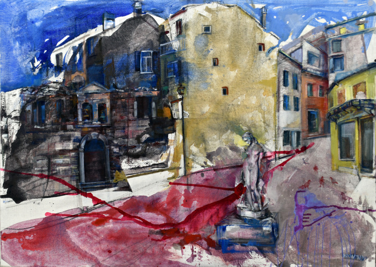 Κατά τη διάρκεια των δύο περιόδων της καραντίνας και ειδικά της δεύτερης, πήρα τους δρόμους όπως άλλωστε και οι περισσότεροι. Όντας κάτοικος Κυψέλης, οι εξορμήσεις στην περιοχή Κυπριάδου, που έχει ωραία σπίτια και ατμόσφαιρα παλιάς αστικής και καλλιτεχνικής γειτονιάς, ήταν συχνές. Τότε, στη συμβολή των δρόμων Αγίας Λαύρας, Χαλεπά και Ροστάν την συνάντησα για πρώτη φορά. Άνυδρη όπως ήμουν από τέχνη, την κοιτούσα κάμποση ώρα και τη φωτογράφισα. Την έκανα έργο, φόρο τιμής στον Giorgio de Chirico, για την ατμόσφαιρα που δημιουργεί με τις άδειες πλατείες, και στην υποβλητική, αγαπημένη Κέρκυρα. Στην πορεία έμαθα πως τη λένε Εύα, τη φιλοτέχνησε ο γλύπτης Γρηγόριος Ζευγώλης και ήταν παραγγελιά του Πικιώνη, κατοίκου της περιοχής. Μία φίλη μου, που είδε το έργο μου, μού είπε ότι η κόκκινη κηλίδα που διατρέχει το άγαλμα του νέου κοριτσιού τονίζει εμφατικά την έννοια της εφηβείας. Ωραίες συζητήσεις!
