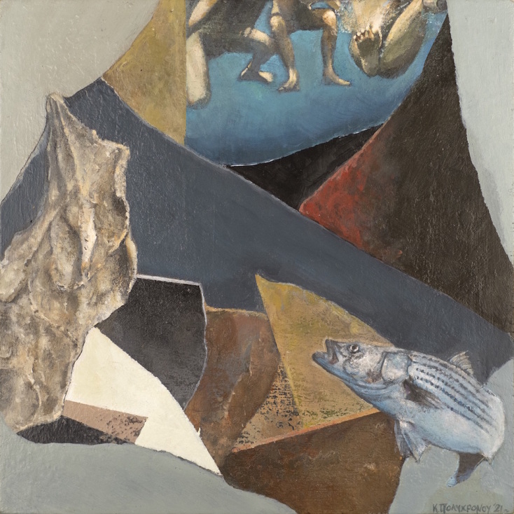 Ψάρια έξω από το νερό, κατσίκια στο χείλος του γκρεμού, πουλιά που στέκονται σε γεωμετρικά χαλάσματα και παραδίπλα λουόμενοι σε γαλάζια νερά. Ξωμάχοι που δουλεύουν σε άγονη γη, κορίτσια που ξαποσταίνουν κάτω από περίεργους ίσκιους, άντρες που παρατηρούν περίεργες μηχανές μέσα σε σπηλιές. Συνεχώς ανατρέπεις τις κλίμακες, είτε προσωπογραφώντας τις φιγούρες σου ολόκληρες είτε εντάσσοντας τες σαν κουκκίδες μέσα σε ένα όλον. Παρατηρώ από ψηλά αλλά και στέκομαι ακριβώς απέναντί τους. Προς τι αυτές οι περίεργες ισορροπίες και οι συνεχείς αιωρήσεις και αμφιταλαντεύσεις;
