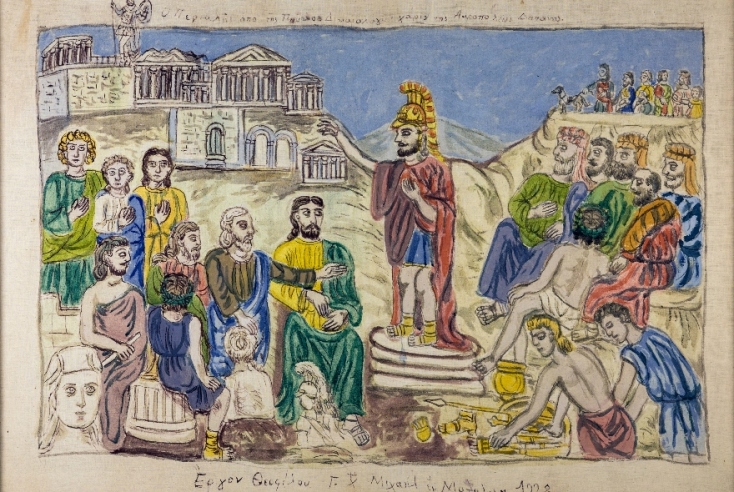 «Ὁ Περικλῆς ἀπὸ τῆς Πνυκὸς Δικαιολογῶν χάριν τῆς Ἀκροπόλεως Δαπάνα»,1928, Συλλογή Μουσείου Θεόφιλου Δήμου Μυτιλήνης