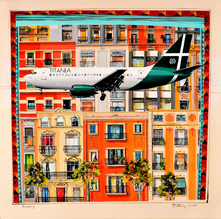 Κατά τη κ. Λουίζα Καραπιδάκη, που έχει την επιμέλεια της έκθεσης, η Τιτάνια «...αποτυπώνει προσόψεις οικοδομημάτων, εσωτερικούς χώρους, θαλασσινά τοπία, δρόμους και σοκάκια, μνημεία πολιτιστικής κληρονομιάς, θρησκευτικά κτήρια, παραδεισένιους κήπους, σκηνές της καθημερινής ζωής, σημαίες και σύμβολα για να αποδώσει τη διαφορετική ταυτότητα του κάθε προορισμού και την περιρρέουσα ατμόσφαιρα. Αξιοσημείωτη είναι η ανθρώπινη απουσία στις πολυσύνθετες απεικονίσεις του, αφού μόνον στο τέλος της μακράς περιοδείας του σε 37 διαφορετικούς προορισμούς ο ζωγράφος σκιαγραφεί ταξιδιώτες σε χώρους αναμονής φανταστικών αεροδρομίων και στη συνέχεια ολοκληρώνει το ιστόρημά του μ’ ένα συμβολικό έργο, όπου το αεροσκάφος της Τιτάνια βρίσκεται στους αιθέρες, έτοιμο για νέες περιπέτειες.