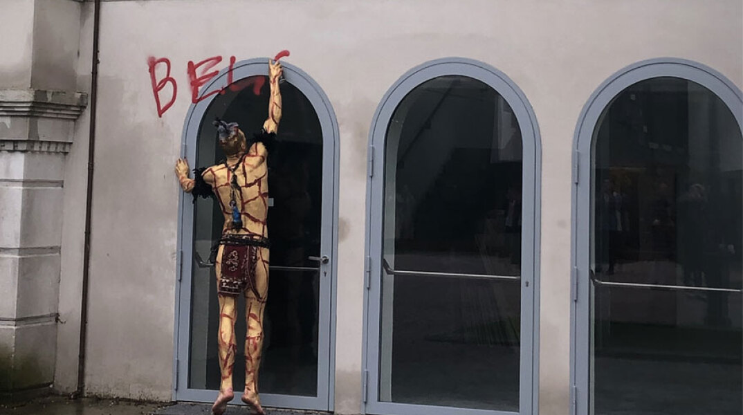 Στη Μπιενάλε της Βενετίας διαδηλωτής στο ρωσικό περίπτερο έγραψε τη λέξη «Belo» με κόκκινο σπρέι. Το βίντεο της Athens Voice από το επεισόδιο.