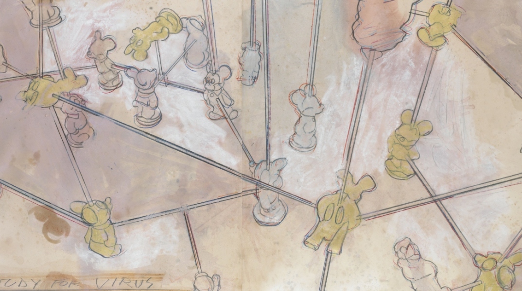 Για παράδειγμα στο συγκλονιστικό Virus του 1989, μικρά γλυπτά-ομοιώματα του Μίκυ Μάους στηριγμένα σε ένα αλουμινένιο πλέγμα δεν σηματοδοτούν την είσοδο στην διάσημη παιχνιδούπολη ή τη μελωδία της ευτυχίας αλλά συγκροτούν την κυτταρική δομή ενός απειλητικού ιού –πόσο προφητικός αλήθεια! Τα δίπολα αλήθεια-ψέμα, πραγματικότητα-ψευδαίσθηση, ασφάλεια και βεβαιότητα-επικινδυνότητα και ασάφεια, σταθερότητα-ρευστότητα, εμφιλοχωρούν σαν ιοί στους αρμούς που συγκροτούν και συγκρατούν τις «προαιώνιες» δομές και διαρρηγνύουν τις κάθε είδους σχέσεις που θεραπεύουν άτομα και πληθυσμούς. Ο Όπενχαϊμ ζει και σχολιάζει το εδώ και τώρα που είναι το εκεί και αύριο και δείχνει τα περίκλειστα τοπία που μας χαρίζονται φαινομενικά προσιτά, φιλόξενα, παιγνιώδη για να θέλγουν αλλά και να αποκρύπτουν ευκολότερα τα παράσιτα που φέρουν κάτω από την αθώα μορφή- επιδερμίδα τους.