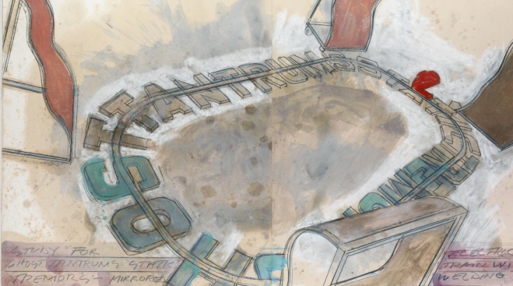 Το Coffee Cup. Image Fallout είναι ίσως ένα από τα αιχμηρότερα και πιο σύνθετα σχόλια του καλλιτέχνη, τουλάχιστον στη σειρά των έργων που παρουσιάζουμε εδώ. Πρόκειται για έναν πυκνό σχηματισμό μικρών χρωματιστών κύκλων, σαν αποτυπώματα από φλυτζάνια καφέ, που αρχίζει να διαλύεται όσο απομακρυνόμαστε προς την περιφέρεια του σχήματος. Από το σύνολο των στοιχείων, όπως απλώνονται στην επιφάνεια, αδυνατεί το βλέμμα του θεατή να εντοπίσει ένα κέντρο. Είναι σαν να μην υπάρχει αφετηρία, σημείο στήριξης ή κέντρο βάρους και μοιραία ο σχηματισμός παρουσιάζει σημάδια αποσύνθεσης. Οι μικροί κύκλοι απομακρύνονται χωρίς σχέδιο και χωρίς πυξίδα πορείας. Τα άτομα κινούνται χωρίς έρμα σε φυγόκεντρες πορείες. Είναι άραγε η αναζήτηση της ελευθερίας μακριά από την αγέλη και τον κομφορμισμό της ή η δυστοπία της μοναξιάς και του απόλυτου ατομικισμού, αφού ο ιστός που συνδέει τα μέλη του «οργανισμού» σιγά ή γρήγορα αποσυντίθεται; Έχει ενδιαφέρον να αντιπαραβάλει κανείς την κατασκευή που αντιστοιχεί στο σχέδιο που εξετάζουμε. Μια κατασκευή που αποθεώνει το τυχαίο και επιβεβαιώνει ερωτηματικά, αμφιβολίες και διλλήματα για την διαδρομή και την τύχη ενός φυγόκεντρου και ανερμάτιστου κόσμου. Είμαστε άλλωστε στα 1989. Τα τότε κραταιά τείχη καταρρέουν «εν μια νυκτί» και ο κόσμος αλλάζει «δίχως να κοιτάζει τη δική μας μελαγχολία».