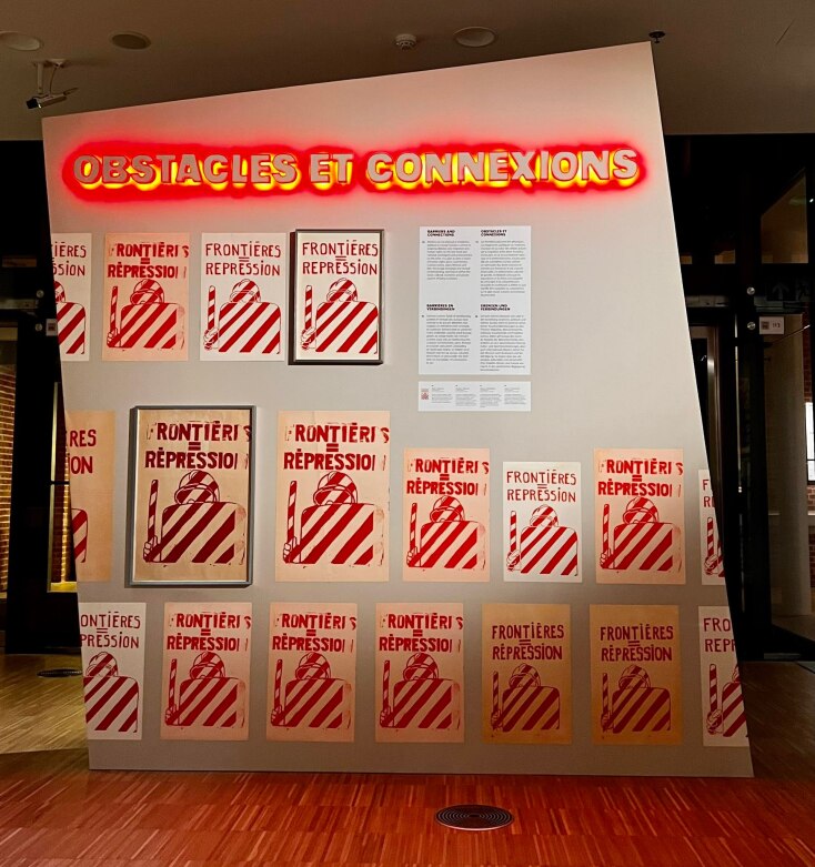 Η ενότητα «Κινητοποίηση και διαμαρτυρία» μιλά για την καταπίεση και για τα ανθρώπινα δικαιώματα. Μεγάλα πανό από διαδηλώσεις δίνουν τον τόνο. Κυριολεκτικά την τελευταία στιγμή, μου είπε ο επιμελητής – η έκθεση άνοιξε τον Απρίλιο και το περιεχόμενό της ήταν έτοιμο από το περασμένο φθινόπωρο – προστέθηκαν τρεις πολύ συγκινητικές αφίσες διαμαρτυρίας για τον πόλεμο στην Ουκρανία.