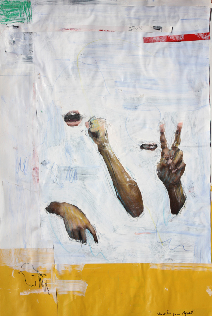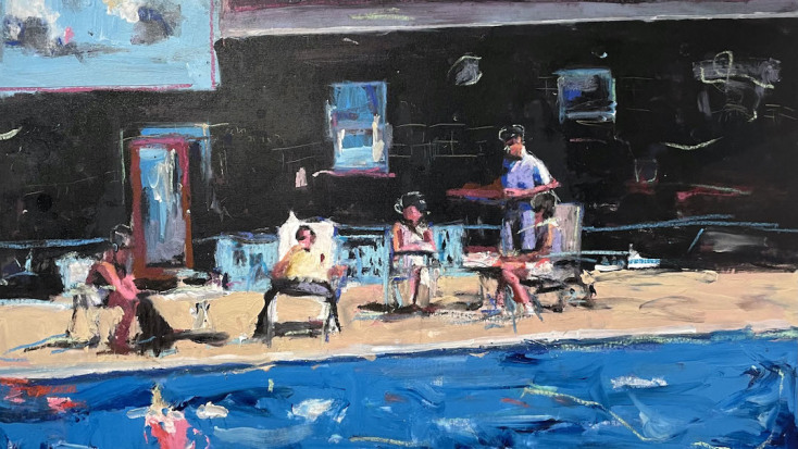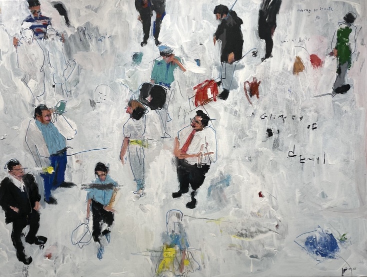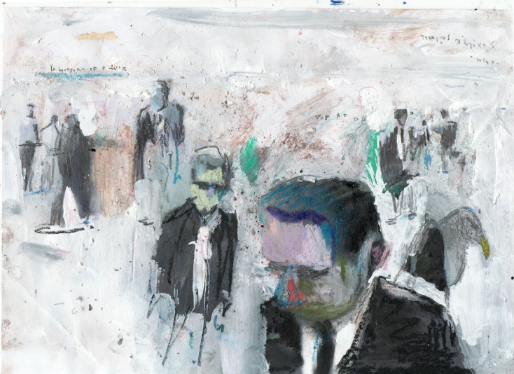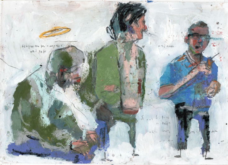 Οι πρωταγωνιστές του Liminal Spaces, όπως παρατηρώ τα κεφάλια τους στον συνεργατικό και αρτίστικο χώρο bord de l’eau, δεν έχουν μάτια, στόμα, μύτη και αυτιά. Tα πρόσωπά τους είναι απροσδιόριστα, αφανή, η αμηχανία όμως σαν κυρίαρχο συναίσθημα, παρά τη λυρική αφαίρεση των χαρακτηριστικών τους, ανιχνεύεται ξεκάθαρα μέσα από την ακινησία των σωμάτων τους. Σώματα σε τόπους απροσδιόριστους επίσης. Κοντά σε νερό (παραλίες ή πισίνες ξενοδοχείων) ή μέσα σε άγονα, άδεια, αχανή διαστήματα. Δικά του τα λόγια: «[…]σκάβω να βρω αναμνήσεις να θυμηθώ ποιος είμαι, να μαζέψω υλικά για να σχηματίσω ποιος θα γίνω, αιώρηση χώρου, αιώρηση ψυχής, και νου. Κοκτέιλ μελαγχολίας - άγχους, εσωτερική αναζήτηση[…] Υπάρχει ένας ενδιάμεσος χώρος που μοιάζει με αυλή συναισθημάτων, χρωμάτων και εμπειριών, τίποτα δεν είναι πλήρως διαμορφωμένο ακόμη, καθώς δεν βρίσκομαι ούτε στο σπίτι αλλά ούτε στον έξω κόσμο».
