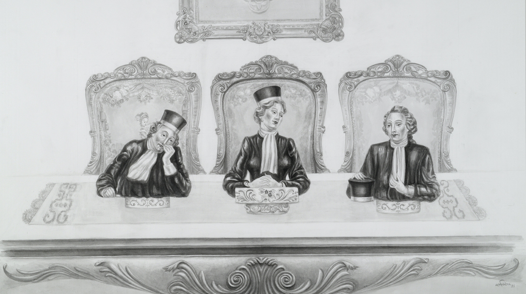 Θα θέλατε να μας αποκαλύψετε κάποιες από τις επώνυμες πηγές σας; Χρησιμοποιήσατε, από όσο γνωρίζω, αληθινούς πίνακες της δυτικής τέχνης; Πώς τους διαλέξατε, ποιων ζωγράφων και ποιους απεικόνιζαν; Βέβαια η σινική μελάνη σας τους απάλλαξε από κάθε είδους χρώμα, λάμψη και κάλλος· το μόνο που απέμεινε αλώβητο από την παλαιά βαρύτητα, το κύρος και την εξουσία των αλλοιωμένων πρωταγωνιστών σας είναι το εντυπωσιακό dress code τους, οπότε θα ήθελα να μάθω την ταυτότητα έστω και ενός από αυτούς…