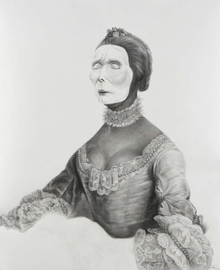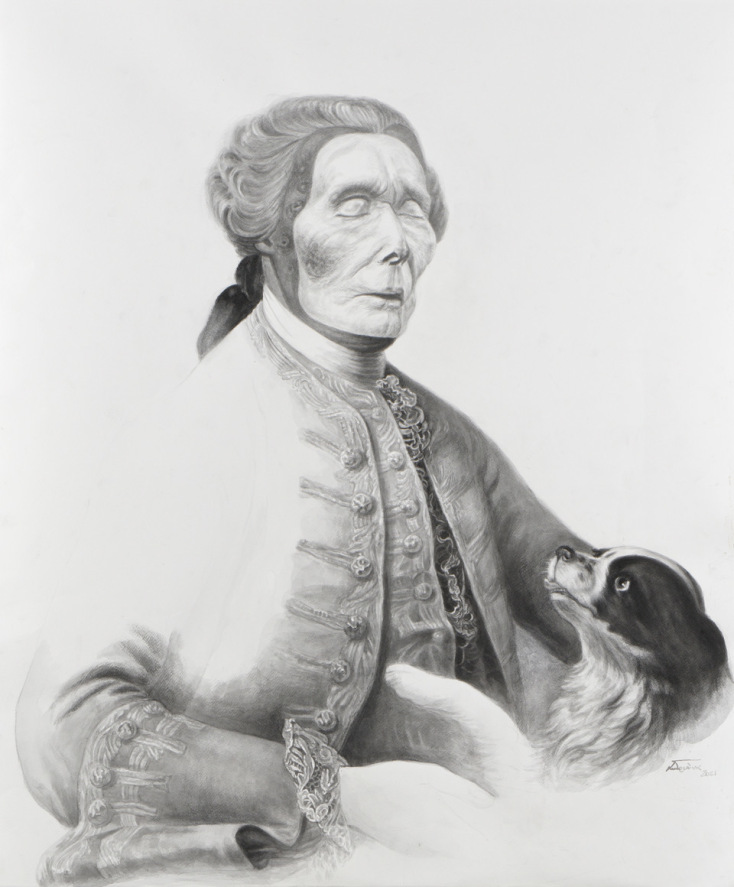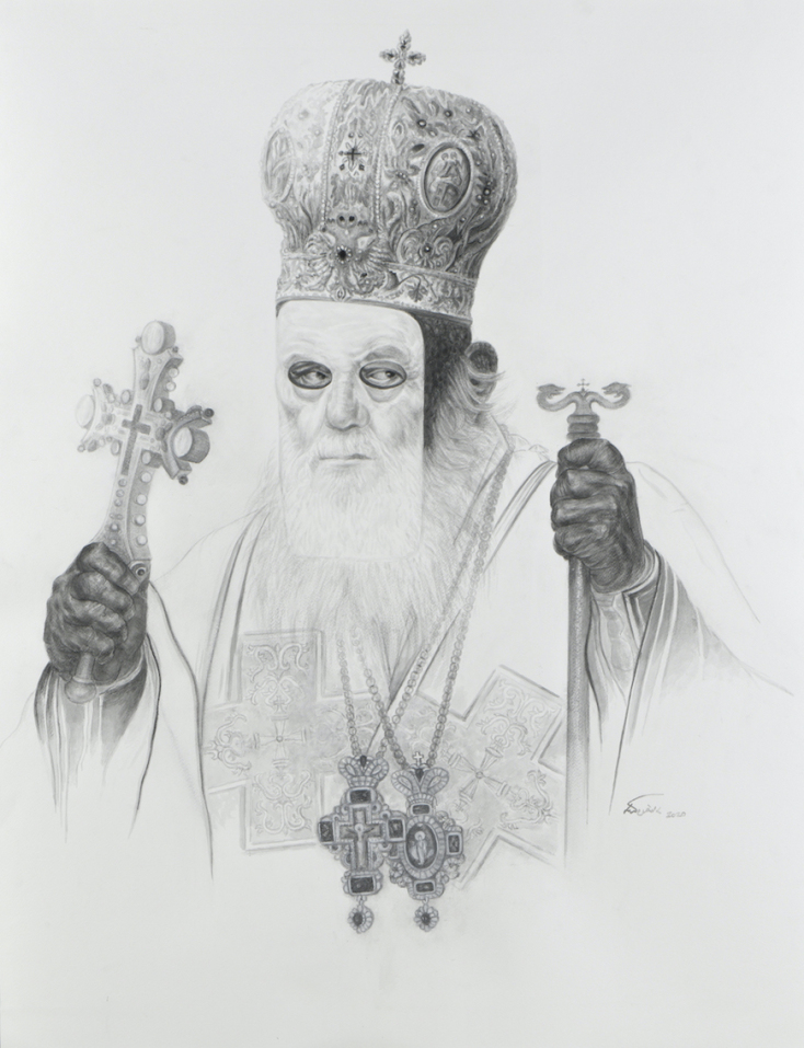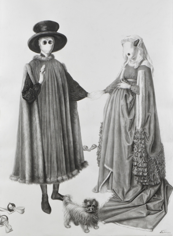 Είναι έργα από την πρώιµη και την κυρίως Αναγέννηση καθώς και ένα πορτρέτο που φιλοτέχνησε ένας πολύ γνωστός κι αγαπητός Έλληνας ζωγράφος του περασµένου αιώνα. Τέλος, για ένα έργο χρησιµοποίησα σύγχρονη φωτογραφία του εικονιζόµενου προσώπου την οποία βρήκα στο διαδίκτυο. Γενικά προτιµώ να µην καθοδηγώ τους θεατές ως προς το ποια καταξιωµένα από την ιστορία τέχνης έργα αναπαράγω στρεβλωµένα µέσα από τα δικά µου έργα. Νοµίζω ότι έτσι λειτουργεί καλύτερα η εντύπωση για τον θεατή ότι κάτι που του είναι οικείο και θαυµαστό ως εικόνα -κι ας µην είναι σε θέση ο ίδιος να την ταυτίσει µε το πρότυπό της- ξαφνικά βρίσκεται µπροστά του διαποτισµένη από την αίσθηση του ανοίκειου. Θα ήθελα ιδανικά να δω από κοντά ξανά όλα αυτά τα έργα και θα ήταν πολύ πιο πρόσφορη η µελέτη τους, αν προµηθευόµουν πολύ καλές µουσειακές εκτυπώσεις τους. Υπήρξα άτυχη ως προς αυτό, µεσολάβησε η καραντίνα που επέβαλε την αναζήτησή τους µόνον µέσω του διαδικτύου.Τα έργα επιλέχθηκαν από την πλούσια παράδοση της Δυτικής ζωγραφικής, εκεί υπάρχουν πορτρέτα των ισχυρών µορφών εξουσίας τα οποία είναι αναγνωρίσιµα λόγω της µεγάλης προβολής τους από τα μουσεία της Ευρώπης. Κι είναι γνωστότερα από τα αντίστοιχα έργα της γλυπτικής, διότι προσφέρουν εικόνες πλούσιες σε χρώµα και σε διάκοσµο µε τις οποίες ταυτίζεται πιο εύκολα ο καθένας µας. Όµως νοµίζω πως η σχεδιαστική µου προσέγγιση µε την κινέζικη µελάνη δεν έχει αφαιρέσει παρά ελάχιστες ερριµµένες σκιές που είναι παραπλανητικές για την ανάδειξη του γλυπτικού όγκου των µορφών. Όλα τα στοιχεία, το χρώµα ως δύναµη τονική, οι λάµψεις των κοσµηµάτων, οι υφές των ρούχων, των γούνινων στοιχείων, οι διαφάνειες, θεωρώ πως έχουν αποδοθεί µε όση δυνατότητα επέτρεψε η δυσκολία του υλικού (της µελάνης) που δεν επιδέχεται καµία διόρθωση, καθώς και η δική µου αντιληπτική ικανότητα και δεξιότητα, έστω και µέσα από τη µικρή οθόνη του υπολογιστή µου.
