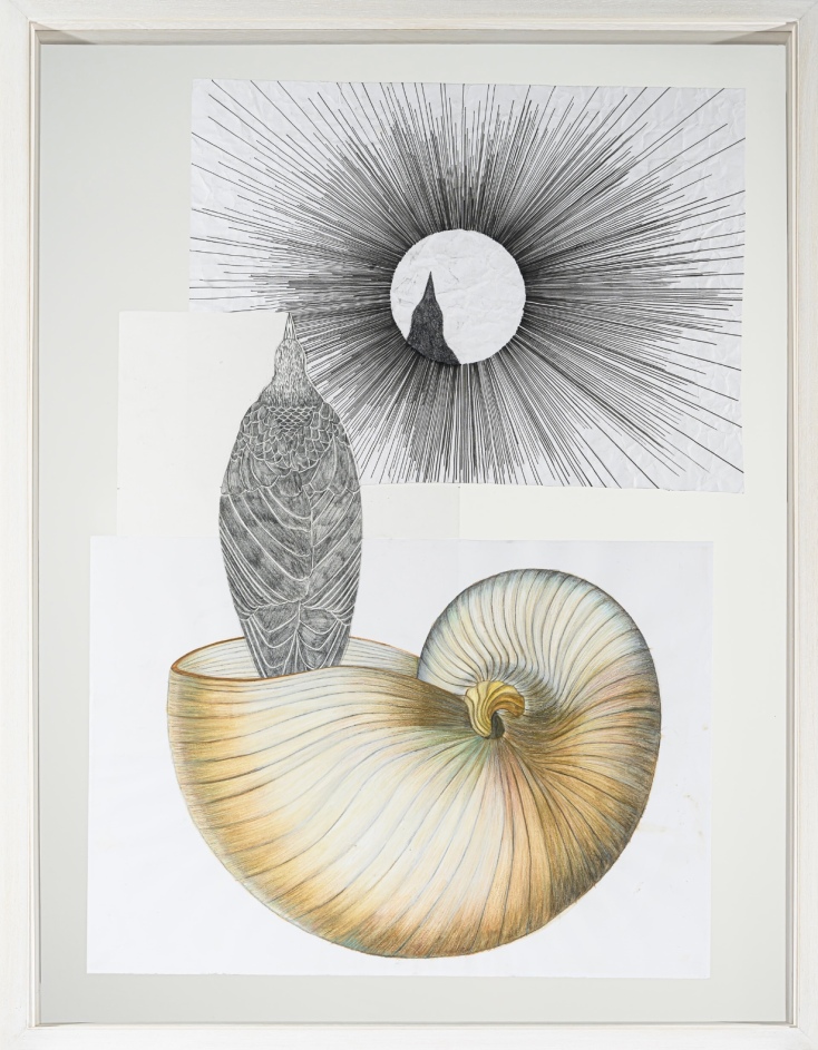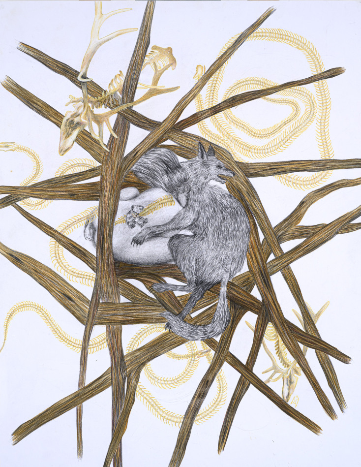 Μια λύκαινα ανάμεσα σε οστά και σκελετούς ζώων, κόκκαλα απλωμένα πάνω στο χώμα ανάμεσα σε αφρισμένες πράσινες θάλασσες, μια μάνα και τα πεινασμένα πουλιά-παιδιά της, πετούμενα που αναδύονται μέσα από κελύφη, θηλυκές κώμες-φωλιές. Στη νέα έκθεση της Αλεξίας Ιμάνο Μαρούλη, με τίτλο «Wildlife and the wild woman», στην γκαλερί Άλμα στο Κολωνάκι, η γυναικεία φύση συναντά την άγρια, σε μιαν αφήγηση που ξεδιπλώνεται με ποικίλα υλικά και τεχνικές –με λάδια, ακρυλικά και κάρβουνο στον μουσαμά, με μολύβια στο χαρτί, αλλά και στην γυάλινη επιφάνεια του βιτρώ.