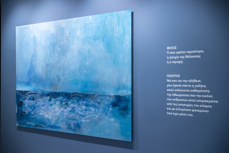 Οι φλόγες, τα φεγγάρια και η θάλασσα έγιναν οι λέξεις-εικόνες που καθοδήγησαν τον γνωστό ζωγράφο στην εικαστική του ενασχόληση με τον νεανικό λυρισμό του Σολωμού. Γιατί, πέρα από τον «Διάλογο», στο κάδρο βρέθηκαν και τρία ακόμα ποιήματα που «δέθηκαν» με δημιουργίες του σε εκδόσεις («Ύμνος στη σελήνη», «Μια φωνή», «Η σκιά του τυφλού ποιητή»). Οι δυο φωτιές –που ως έργο ανοίγουν και την έκθεση– είναι η σημαντικότερη ανακάλυψη που του επιφύλαξε αυτό το ταξίδι, μου λέει, «το δίπολο, και όχι το μονοσήμαντο, που ενυπάρχει σε κάθετί, στον διάλογο, στην πάλη. Οι δυο καρδιές, οι δυο σκέψεις. “Είναι δυο φλόγες, μια στο νου, άλλη στην καρδιά, αναμμένες από τη φύσι εις κάποιους ανθρώπους” γράφει ο Σολωμός».