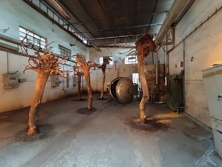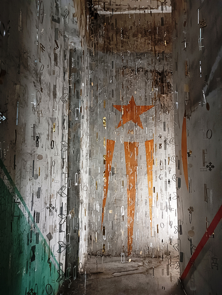 Μέσα σε ένα πρώην δωμάτιο συγκέντρωσης εργαζομένων, εν ώρα ανάπαυλας από την εργασία, η Στέλλα Μελετοπούλου, δημιουργεί ένα νέο περιβάλλον με πολυάριθμα βιομηχανικά στοιχεία από αλουμίνιο που τεμαχίζονται, επαναχρησιμοποιούνται και κρέμονται από την οροφή, όπως οι ακτίνες εκείνες που κάποτε ζωγραφίστηκαν από κάποιους εργάτες στους τοίχους, γεφυρώνοντας το παρελθόν με το παρόν.