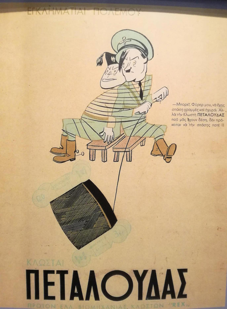 Μία δε διαφήμιση που είχε κάνει πολύ μεγάλη αίσθηση εκείνη την εποχή (Ιούνιος, 1944), στην ακόμη κατεχόμενη Ελλάδα, ήταν ένα πόστερ που απεικόνιζε δεμένους σε μία καρέκλα τον Χίτλερ και τον Μουσολίνι, με τον Μουσολίνι να αποκρίνεται στον πρώτο: «Μπορεί, Φύρερ μου, να έχεις σπάσει γραμμές και οχυρά. Αλλά την κλωστή Πεταλούδας που μας έχουν δέσει, δεν πρόκειται να την σπάσεις ποτέ». (Το κείμενο είχε γράψει ο ίδιος ο Μουζάκης.)