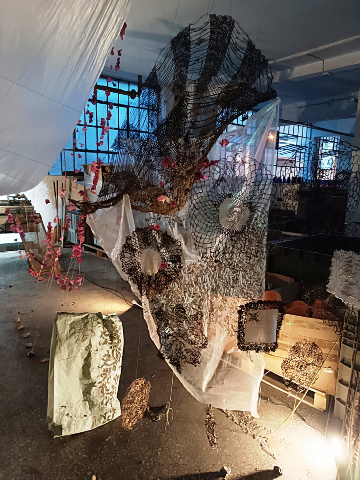 Με παραδοσιακές πρακτικές ύφανσης, πλεξίματος και κατασκευής δικτύων ψαρέματος που είδε και έμαθε από το νησί της, την Πάρο, χρησιμοποιώντας φύκια από το Αιγαίο και τον Ειρηνικό, αλλά και χρυσά και μπρούτζινα νήματα από την ΠΕΤΑΛΟΥΔΑ, η Δήμητρα Σκανδάλη, υποδηλώνει με το έργο της τους μηχανισμούς και τις προσεγγίσεις που δυνητικά θα μας επιτρέψουν να επανασυνδεθούμε με την ιστορία μας, υπογραμμίζοντας τη σημασία της ανάκτησης της γνώσης τους παρελθόντος.