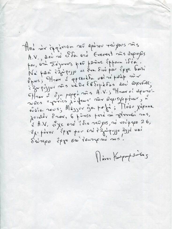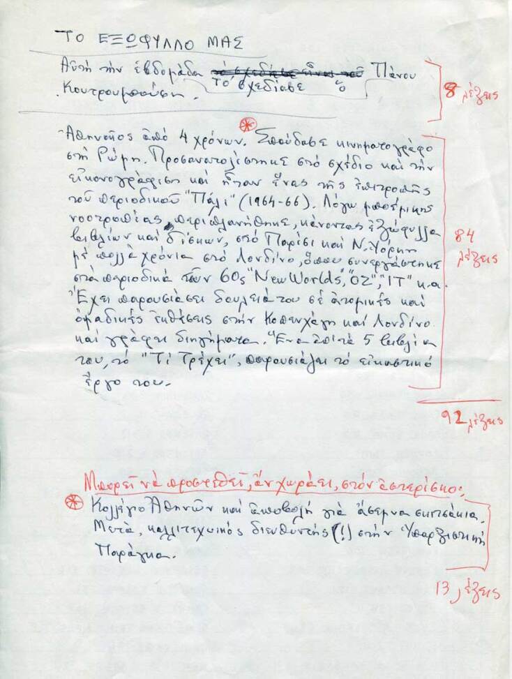 «Από την εμφάνιση του πρώτου τεύχους της A.V., που το είδα στο Everest της περιοχής μου, στη Σόλωνος, μου μπήκε έμμονη ιδέα. Να μπει εξώφυλλο κι ένα δικό μου έργο. Γιατί όμως; Ήταν η φρεσκάδα και το μπαμ των εξωφύλλων της κάθε εβδομάδας που περνούσε; Ήταν η όλη μορφή της A.V.; Ήταν οι πρωτότυπες «γωνίες λήψεως» των περιεχομένων, η ουσία τους; Μάλλον όλα μαζί; Πόσο χάρηκα λοιπόν όταν, 6 μήνες μετά τη γέννηση της, η A.V. είχε στο ίδιο τεύχος, το νούμερο 26, όχι μόνον έργο μου στο εξώφυλλο αλλά και δεύτερο έργο στο εσωτερικό της!»
