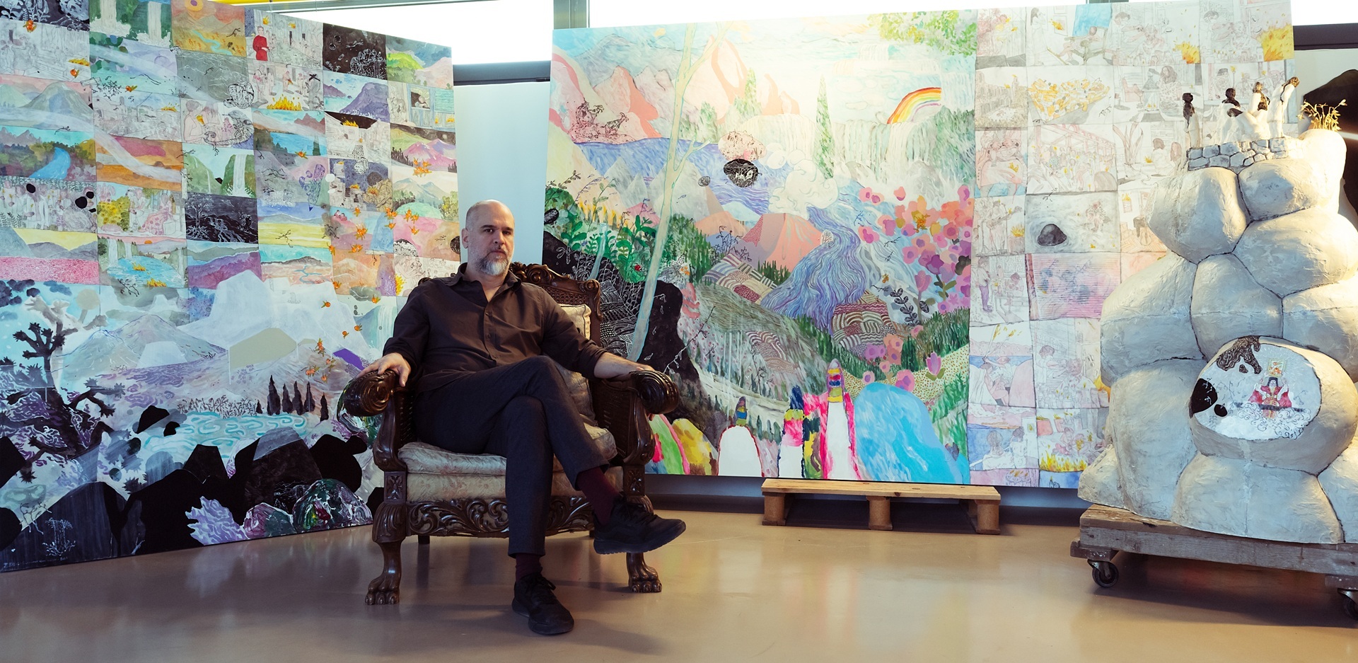 Μέσα στο εργαστήριο του καλλιτέχνη Στέφανου Ρόκου, λίγες μέρες πριν από τα εγκαίνια της έκθεσής του. Μεγάλων διαστάσεων πίνακες, έτοιμοι να πακεταριστούν για να μεταφερθούν στην γκαλερί. Το κυρίαρχο σε όλα τα έργα που είδα είναι το πολύ δυνατό χρώμα, τα ψυχεδελικά τοπία με ποτάμια, καταρράκτες και ουράνια τόξα, τα έντονα ασπρόμαυρα στοιχεία που παρεμβάλλονται και οδηγούν το βλέμμα μας σε κρυμμένες εικόνες ή μηνύματα, αλλά και η συχνή χρήση εικόνων φωτιάς.Ο εικαστικός με υποδέχτηκε εκεί για να μου εξηγήσει τι θα δούμε στο νέο του project αλλά και να μου λύσει την εύλογη απορία πώς χωράνε 50.000.000 τόνοι τοπίων σε μερικούς καμβάδες.