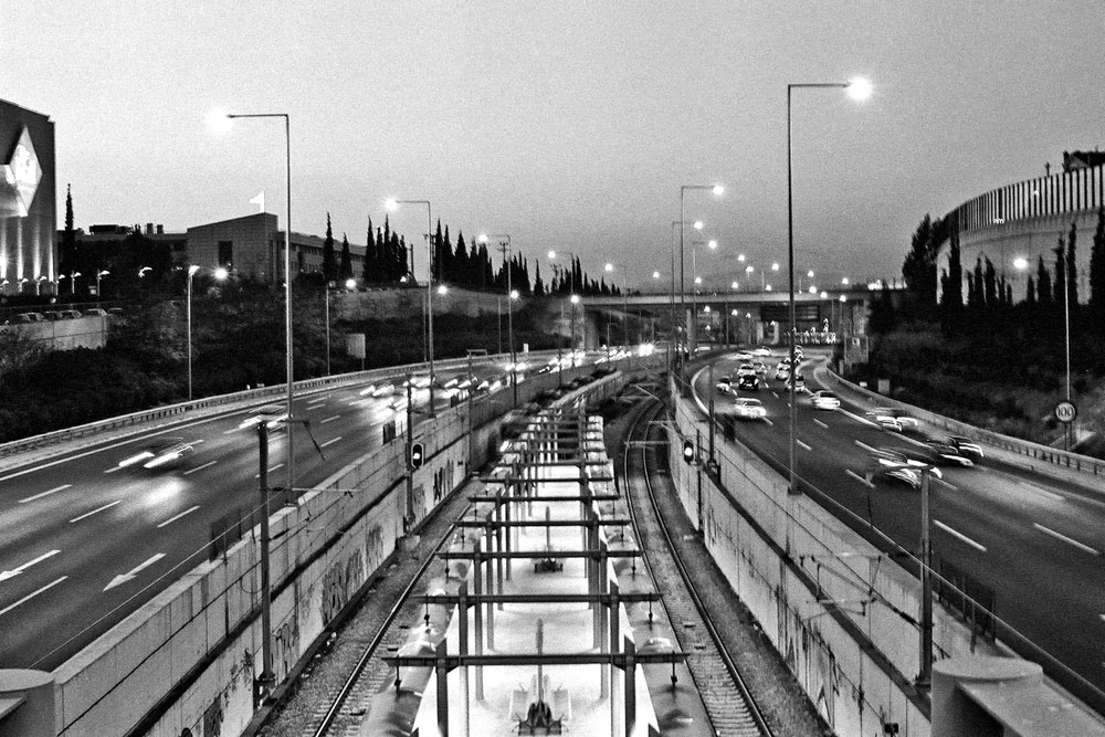 Σε μια τέτοια φάση λοιπόν, τον Νοέμβριο του 2016, επιστρέφοντας από εξωτερικό απογευματάκι και περιμένοντας τη βραδινή πτήση για Χανιά, είπα να πεταχτώ μέχρι εκεί. Η ατμόσφαιρα που συνάντησα, βγαίνοντας από το βαγόνι του Προαστιακού την ώρα που έπεφτε ο ήλιος, ήταν φανταστική! Κυριακή απόγευμα, λιγοστοί μοναχικοί επιβάτες, φθινοπωρινή αθηναϊκή ψύχρα, καθαρός ουρανός, υπέροχο απογευματινό μισοσκόταδο, τα φώτα του σταθμού και της Αττικής Οδού μόλις είχαν ανάψει. Ως ηχητική υπόκρουση κυριαρχούσε ο ήχος από τα διερχόμενα αυτοκίνητα και τους συρμούς των τρένων. Έβγαλα 5-6 φωτογραφίες στα γρήγορα, οι οποίες αργότερα, όταν εμφάνισα τα φιλμ και τις είδα, με έκαναν να θέλω να ξαναγυρίσω για να βγάλω κι άλλες. Aυτό τελικά κατέστη εφικτό το παγωμένο, συννεφιασμένο και σκοτεινό διήμερο 6-7 Ιανουαρίου, ανήμερα των Φώτων και της γιορτής μου, όταν ανέβηκα στην Αθήνα να παρακολουθήσω το Ολυμπιακός - Παναθηναϊκός για την Ευρωλίγκα.
