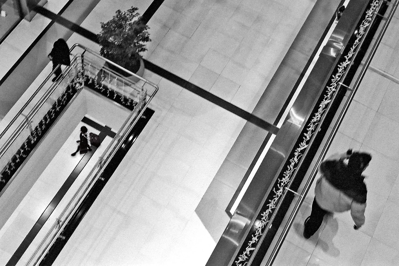 «Δεν επιτρέπεται η φωτογράφιση!» μου φώναξε αγχωμένος ο νεαρός υπάλληλος φύλαξης στο «The Mall» την ώρα που γύρω μου διάφοροι είτε με τα κινητά τους είτε με ψηφιακές κάμερες έβγαζαν φωτογραφίες και selfies ακατάπαυστα! Προφανώς το εκκωφαντικό μεταλλικό «γκλανκ» του μηχανικού κλείστρου της αρχαίας αναλογικής μηχανής μου με πρόδωσε. «Να τη σβήσετε!» συνέχισε με επαγγελματικό πάθος και μου πήρε λίγο χρόνο να του εξηγήσω ότι το φιλμ δεν «σβήνει», την ώρα που εκείνος με κοίταζε με φάτσα απορίας ίδια με εκείνη που παίρνει ο σκύλος μου όταν βλέπει άλλους σκύλους στην τηλεόραση. Προφανώς, βέβαια, ο άνθρωπος ακολουθούσε κάποιες εντολές, κάποιων «υπευθύνων» και σε καμία περίπτωση δεν ήθελα να τον φέρω σε δύσκολη θέση, οπότε δεν έδωσα συνέχεια. Είναι κάτι που το έχω συνηθίσει άλλωστε. Μου συμβαίνουν συνέχεια παρόμοια περιστατικά. Απλά, όπως κάνω πάντα, του είπα να μεταφέρει στους φωστήρες «υπεύθυνους» ότι δεν έχει νόημα να προσπαθήσεις να εμποδίσεις τη φωτογράφιση σε μέρη με τόσο κόσμο και ότι αν παρά ταύτα επιμένεις να θέλεις να βάλεις περιορισμό, θα πρέπει να υπάρχουν σχετικές προειδοποιητικές ταμπέλες και η απαγόρευση να ισχύει για όλους. Τέλος πάντων, αυτή τη μία και μοναδική εικόνα που πρόλαβα και τράβηξα μέσα στο «The Mall» εκείνο το κυριακάτικο απόγευμα του Νοεμβρίου την έχω συμπεριλάβει στο τέλος της ενότητας και την αφιερώνω στους «υπεύθυνους». Αν ενοχλούνται, ας μου κάνουν μήνυση...