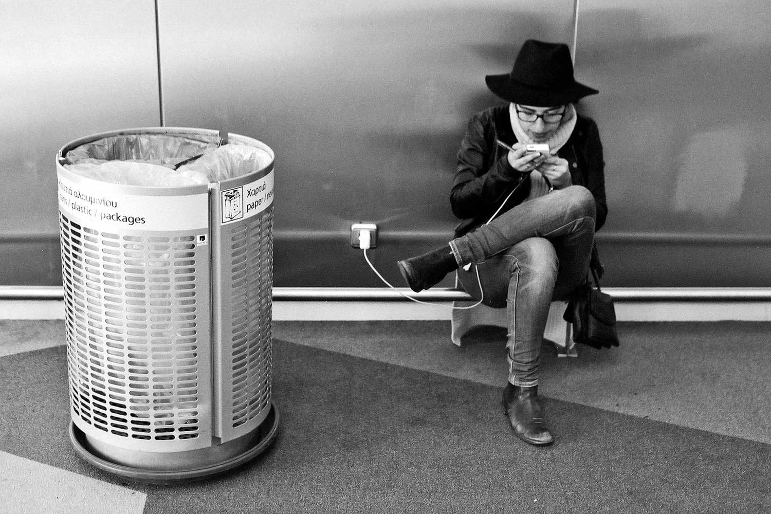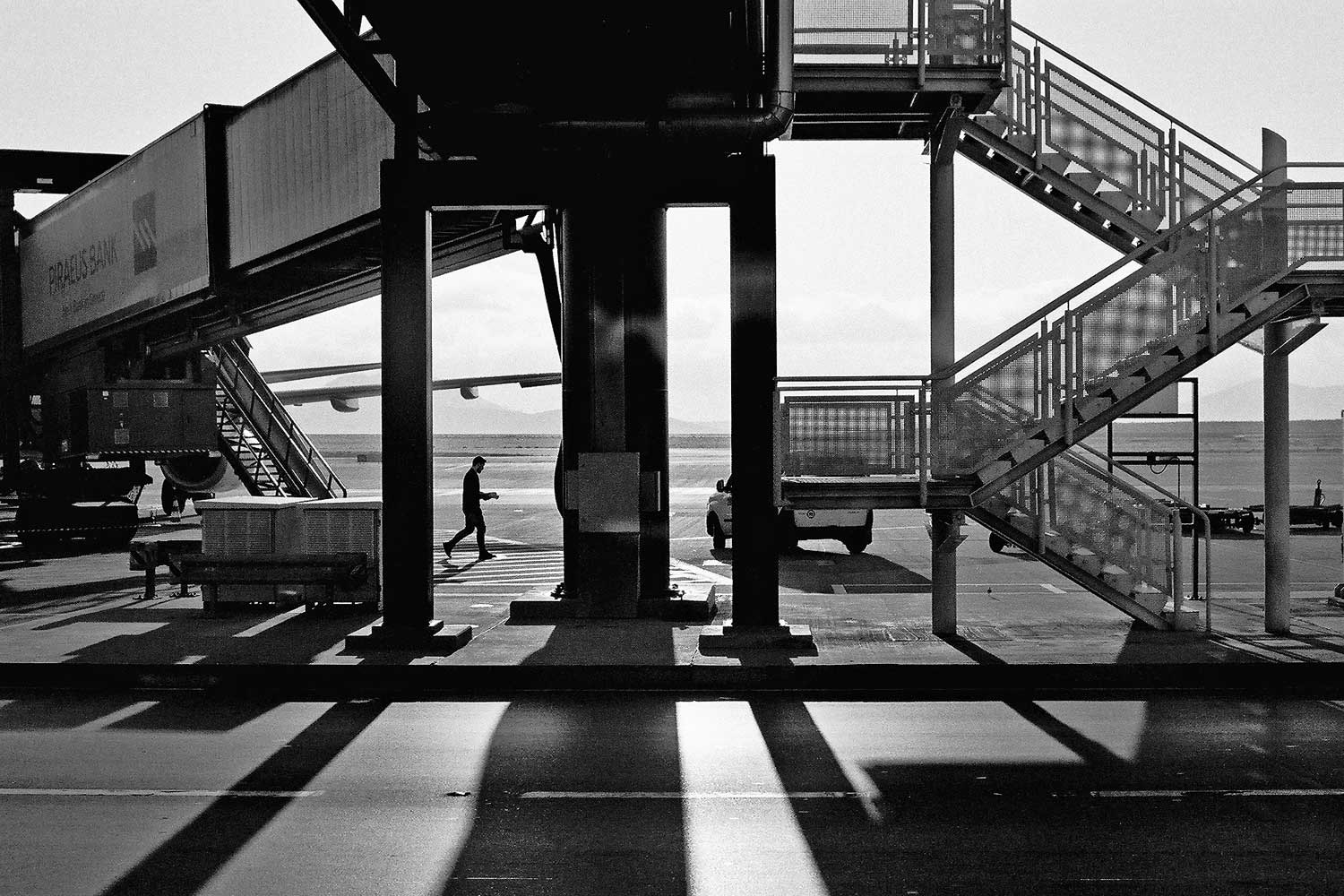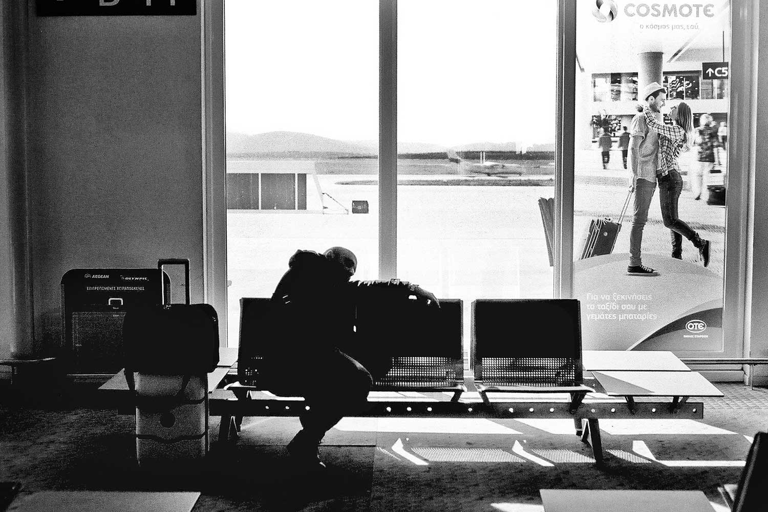 Οι συνθήκες δεν ήταν εύκολες εκείνο το πρωινό στο «Ελ. Βενιζέλος». Πολύ φως έξω, χαμηλός φωτισμός μέσα. Να μη σε πάρουν και χαμπάρι. Ο σκοπός διπλός. Να νικήσω την ανία και την πλήξη, κάτι που σίγουρα επετεύχθη, αλλά και να καταφέρω να μεταφέρω την ατμόσφαιρα που επικρατεί στον μικρόκοσμο ενός αεροδρομίου. Ενός ιδιαίτερου χώρου. Στον οποίο οι περισσότεροι ευρισκόμενοι είναι περαστικοί. Εκεί που ισχύουν αυστηροί κανόνες και πολλαπλοί περιορισμοί. Για όλους! Ανεξαρτήτως προέλευσης ή προορισμού. Σε τελική ανάλυση εκεί που όλοι αναγκάζονται οικειοθελώς να συμμορφωθούν. Χωρίς διαμαρτυρίες και αντιρρήσεις.