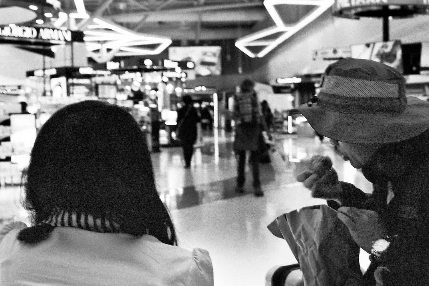 Να βγεις ξανά έξω από το χώρο αναχωρήσεων, να περάσεις από τις αφίξεις, να ξανανέβεις στον επάνω χώρο των αναχωρήσεων. Κάτι να φας, κάτι να πιεις. Να πας μια βόλτα στα μαγαζιά, να διαβάσεις μια εφημερίδα. Κάτι να ξαναφάς, κάτι να ξαναπιείς. Να ξαναπεράσεις το μαρτύριο του ελέγχου. Να πας για κατούρημα. Με όλα αυτά κοιτάω το ρολόι και με το ζόρι έχει περάσει μια ώρα. Βγάζω την κάμερα, κοιτάω τον μετρητή έχει κάπου 20-21 πόζες ακόμα. ΟΚ, να τι θα κάνω τις επόμενες δύο ώρες…