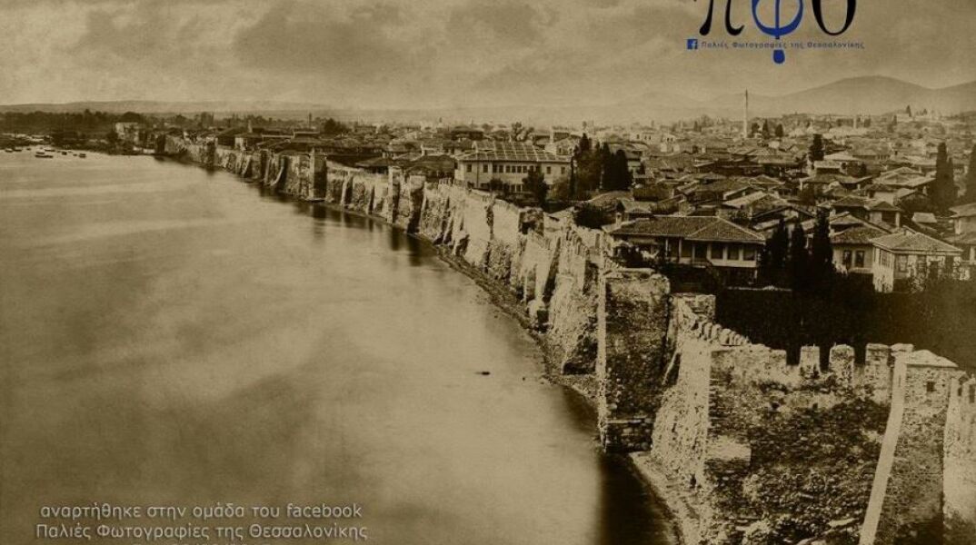 Η φωτογραφία απεικονίζει τη Θεσσαλονίκη (ή ίσως άλλη πόλη) το 1860, λίγα χρόνια πριν την κατεδάφιση του παραλιακού τείχους της πόλης.