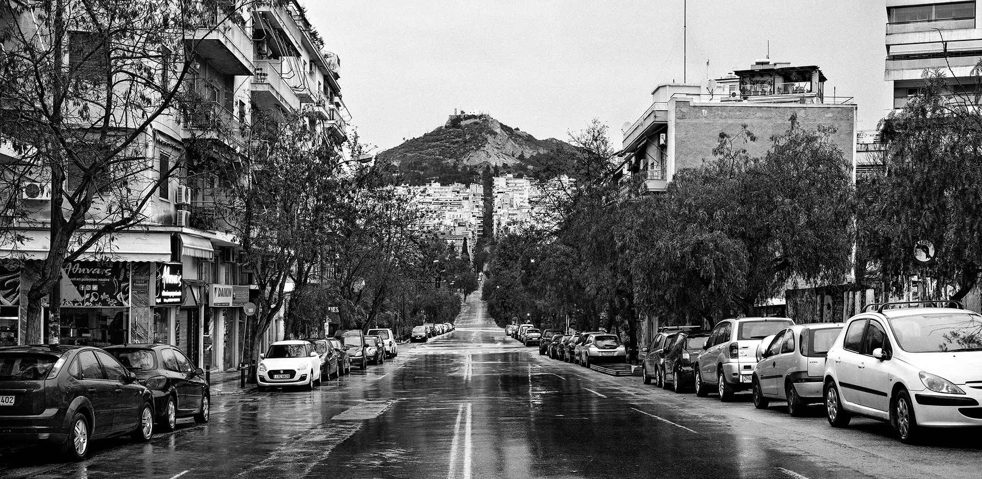 Αρκετές από τις επιλογές μου σχετίζονταν με την σημαντικότητα κάποιων οδών, στο αστικό δίκτυο. Κυρίως εμπορικών οδών, ή κεντρικών δρόμων σε οικιστικές ή εμπορικές γειτονιές. Βέβαια συμπεριέλαβα και αρκετές κεντρικές αρτηρίες ή λεωφόρους. Πάντοτε σε σχέση με την μοναδικότητα της στιγμής ή με το πόσο «αλλόκοτη» φάνταζε μια εικόνα. Φερ’ ειπείν, επέλεξα μία εικόνα της Λεωφόρου Αλεξάνδρας από τις πρώτες μέρες της καραντίνας που φαίνονται τα περιστέρια να κάθονται ανενόχλητα στη μέση του οδοστρώματος ή μια εικόνα της Σπύρου Μερκούρη με ελαφριά ομίχλη, μια όψη επίσης αρκετά λυρική και σπάνια. Σε αυτήν την άτυπη λίστα, δεν θα μπορούσα να μη συμπεριλάβω σημαντικά τοπόσημα της πόλης. Τον Λυκαβηττό τον φωτογράφισα πολλές φορές και από πολλές γωνίες. Τελικά διάλεξα μία εικόνα από τη Ριζάρη. Η λευκή διαχωριστική γραμμή του δρόμου ξεκινούσε από τα πόδια μου, πέρναγε ανάμεσα από τα γυμνά δέντρα της οδού Πλουτάρχου και έφτανε αδιάλειπτα μέχρι το εκκλησάκι του Αγίου Γεωργίου στην κορυφή του λόφου, χωρίς ένα αυτοκίνητο ή έναν πεζό! Με το είδωλό του να αντικατοπτρίζεται στο βρεγμένο οδόστρωμα, ο Λυκαβηττός έμοιαζε σαν μία έρημη αθηναϊκή πυραμίδα· ένα πατρογονικό αθηναϊκό τοπόσημο.