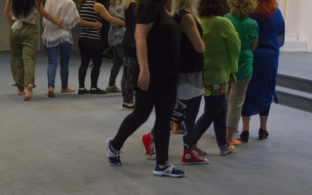 Μετά το καλωσόρισμα του διευθυντή των φυλακών και του γενικού γραμματέα του υπουργείου Δικαιοσύνης, ο Αλέξανδρος Ευκλείδης, καλλιτεχνικός διευθυντής της Εναλλακτικής Σκηνής της ΕΛΣ, μας εξηγεί με δύο κουβέντες, τι είναι το Εργαστήριο χορού. Αυτή η ξεχωριστή αυτή πρωτοβουλία της Λυρικής ξεκίνησε τον Ιανουάριο του 2017 με τη συνεργασία της Χαράς Κότσαλη και της Κατερίνας Σπυροπούλου. Οι δύο χορεύτριες - χορογράφοι, ή απλά «τα κορίτσια της Λυρικής», όπως τις αποκαλούν οι κρατούμενες, κάλεσαν στην αρχή της χρονιάς, όσες αγαπούν το χορό να συμμετάσχουν στο χοροθεατρικό τους εργαστήριο, χωρίς προαπαιτούμενα χορευτικής εμπειρίας, χωρίς ηλικιακούς περιορισμούς. Από τις εβδομαδιαίες τους συναντήσεις πέρασαν 80-100 γυναίκες. Άλλες από περιέργεια, άλλες από προσωπική ανάγκη ‒ο χορός σαν ψυχοθεραπεία‒, άλλες, όπως μια μάνα και μια κόρη, κρατούμενες σε διαφορετικές πτέρυγες, μόνο και μόνο για να συναντιούνται. Τελικά έμειναν 14, μια ετερόκλιτη ομάδα από Ελληνίδες και αλλοδαπές, από ανήλικα κορίτσια, νεαρές γυναίκες αλλά και μεγαλύτερες, 50, 60 ακόμα και 73 χρόνων, που δούλεψε εντατικά και με την καθοδήγηση των «εμψυχωτριών» της, σχεδίασε και έστησε την περφόρμανς που θα παρακολουθούσαμε σε λίγα λεπτά.