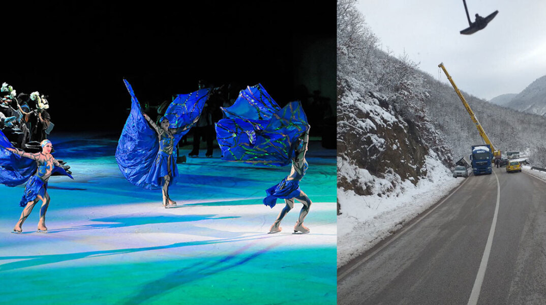 Η καθυστέρηση οφείλεται στις αντίξοες καιρικές συνθήκες, με σφοδρότατες χιονοπτώσεις, που συνάντησαν τα φορτηγά που μεταφέρουν την παγοπίστα και τα σκηνικά του συγκροτήματος από το Σεράγιεβο στην Αθήνα.